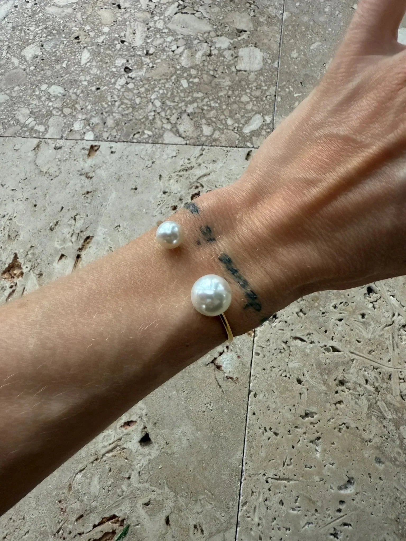 Dette Andcopenhagen-armbånd har en åben bangle-form med sfæriske ender og to hvide perler. Den justerbare størrelse sikrer en god pasform til dit håndled, mens den polerede overflade giver et rent udtryk.