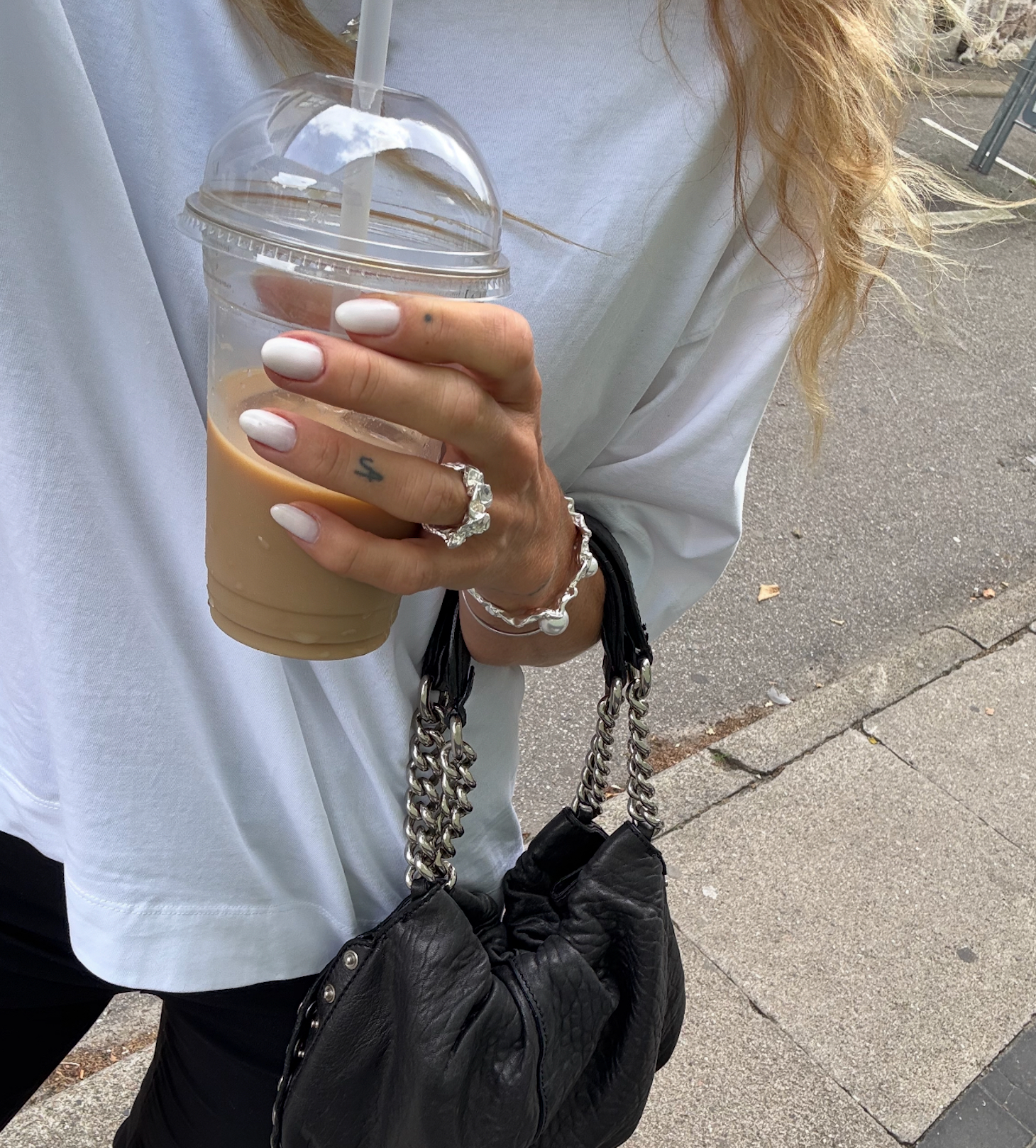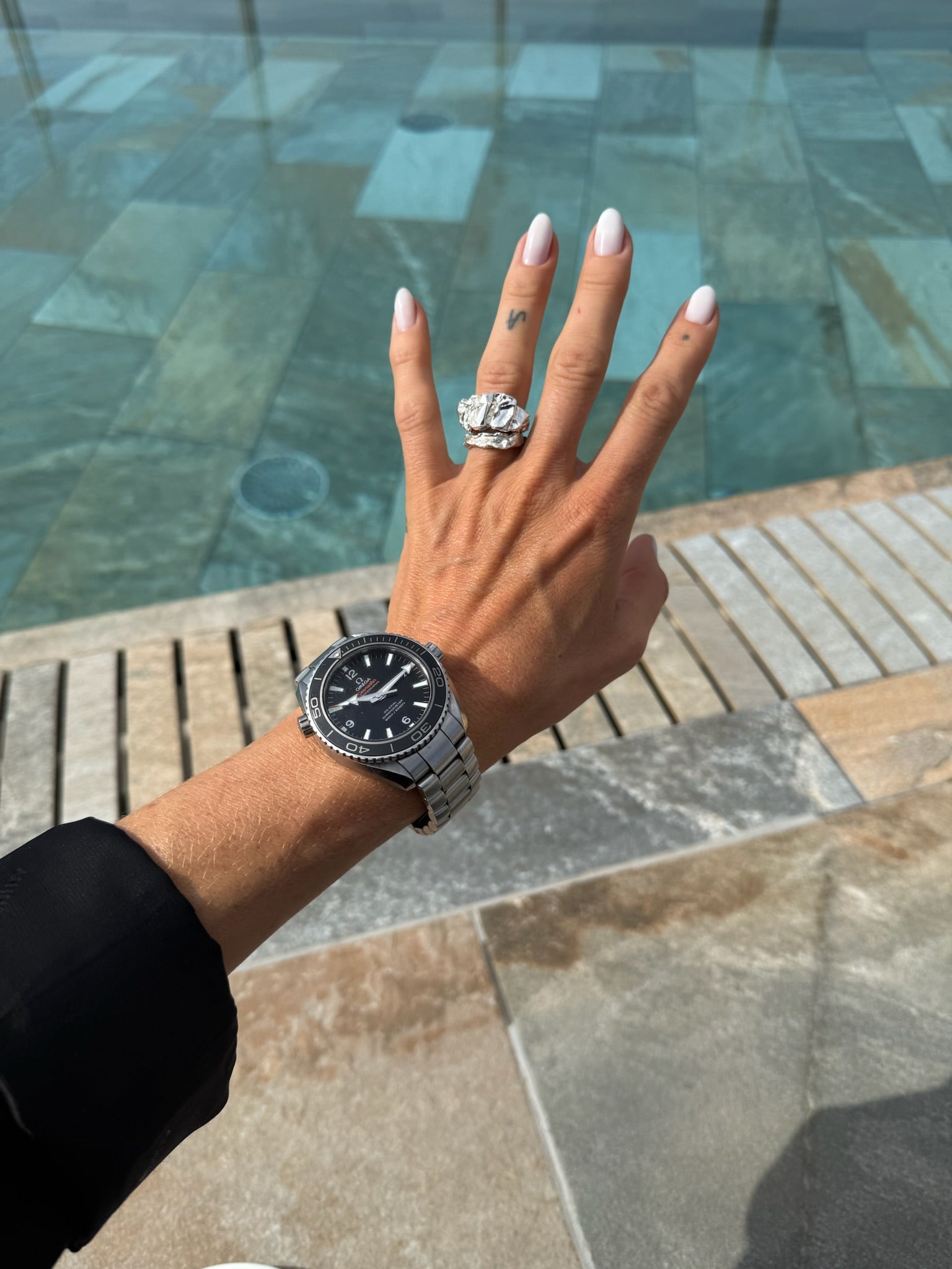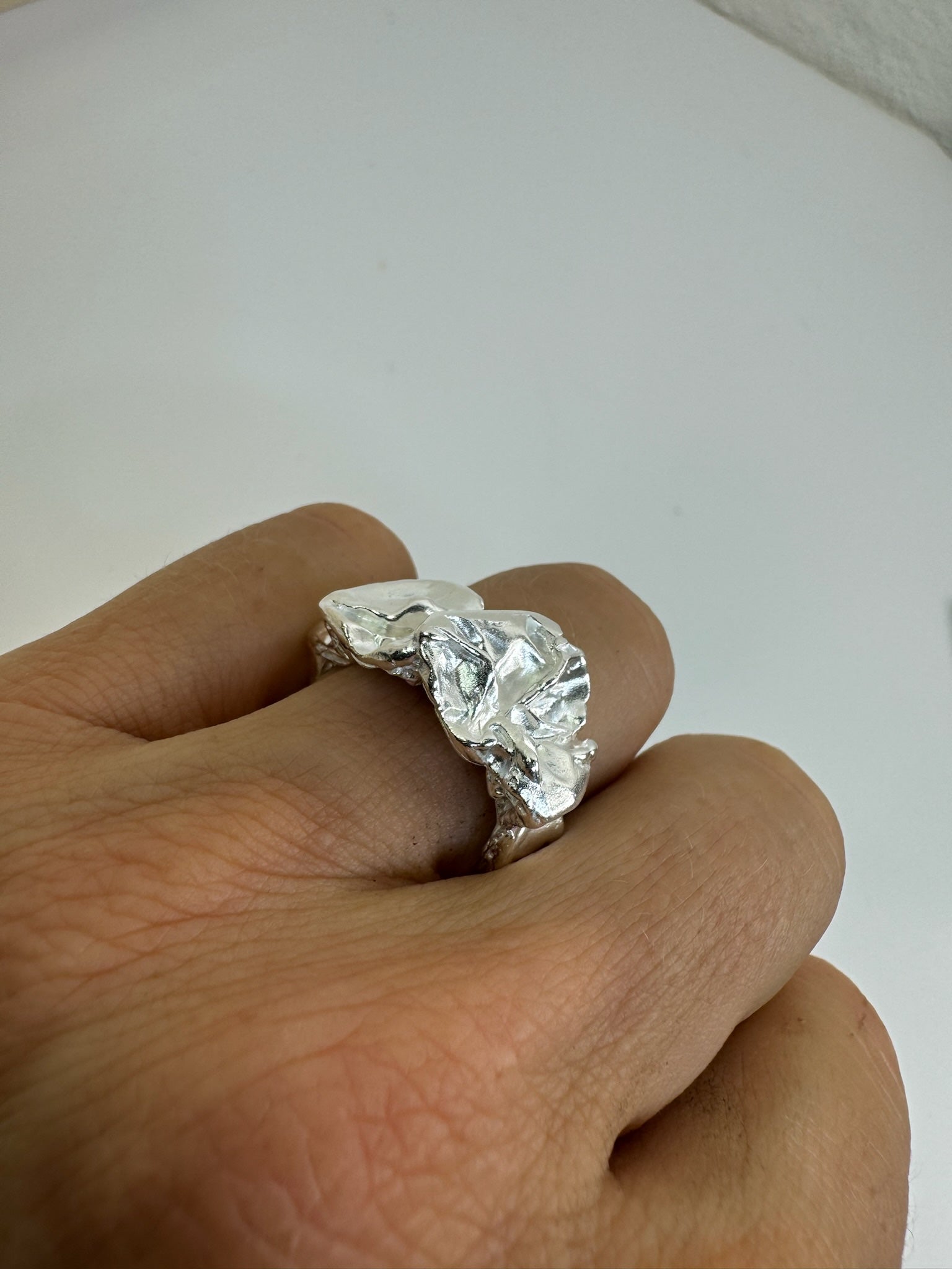 Arlinda-ringen fra Andcopenhagen har en karakteristisk krøllet overflade, der skaber et dynamisk spil mellem lys og skygge. Den justerbare størrelse sikrer en behagelig pasform hele dagen.