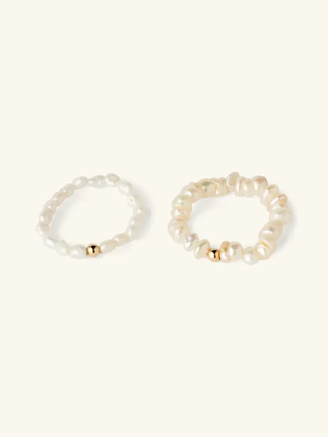 Natalie-ringen kombinerer uregelmæssigt formede ferskvandsperler med en guldfarvet perledetalje. Den justerbare størrelse med elastisk silikonesnor gør den nem at tilpasse til forskellige fingre.