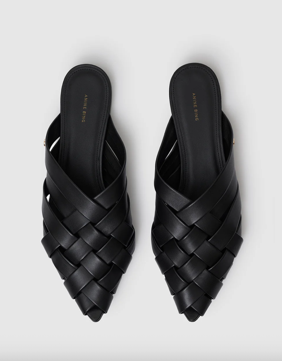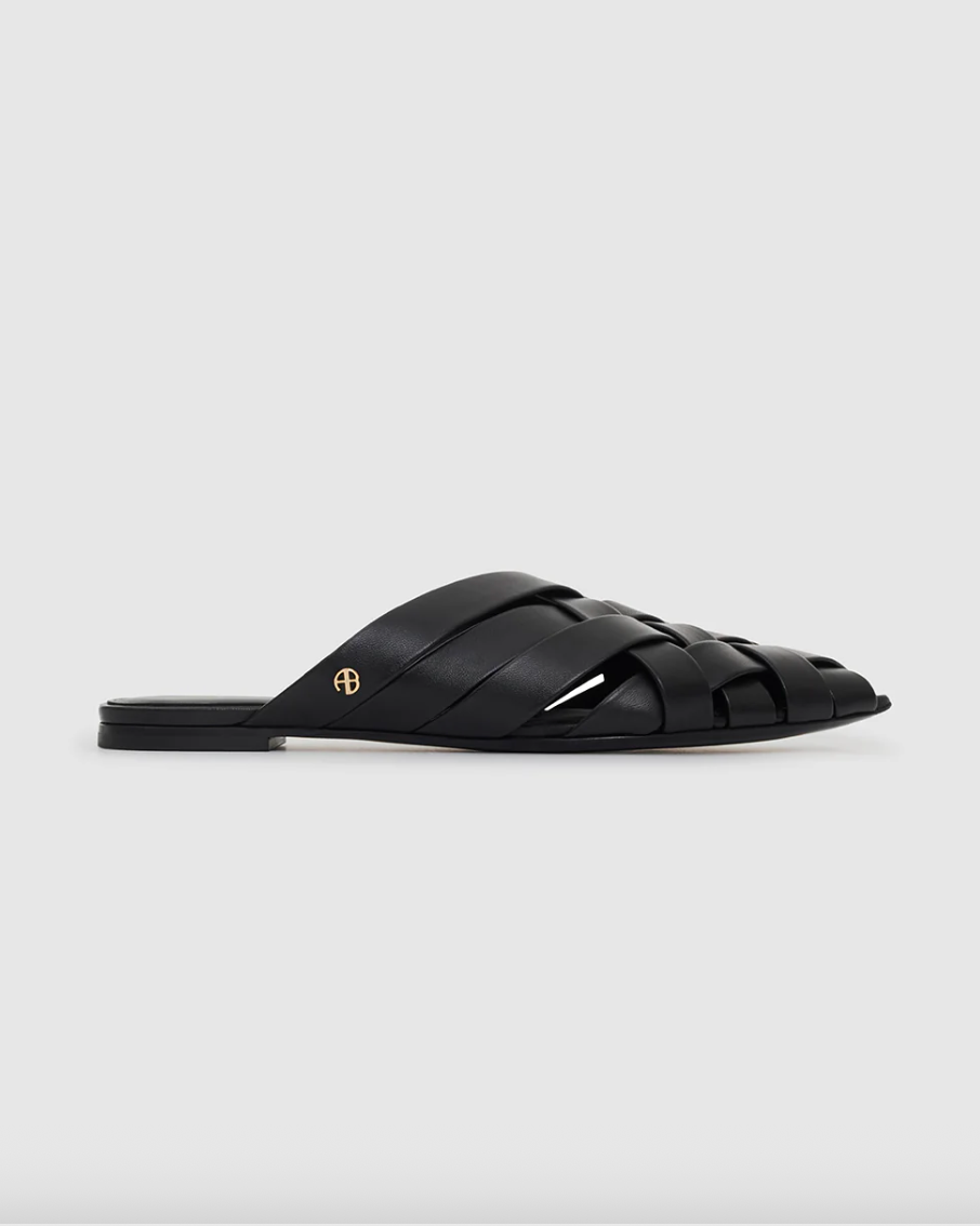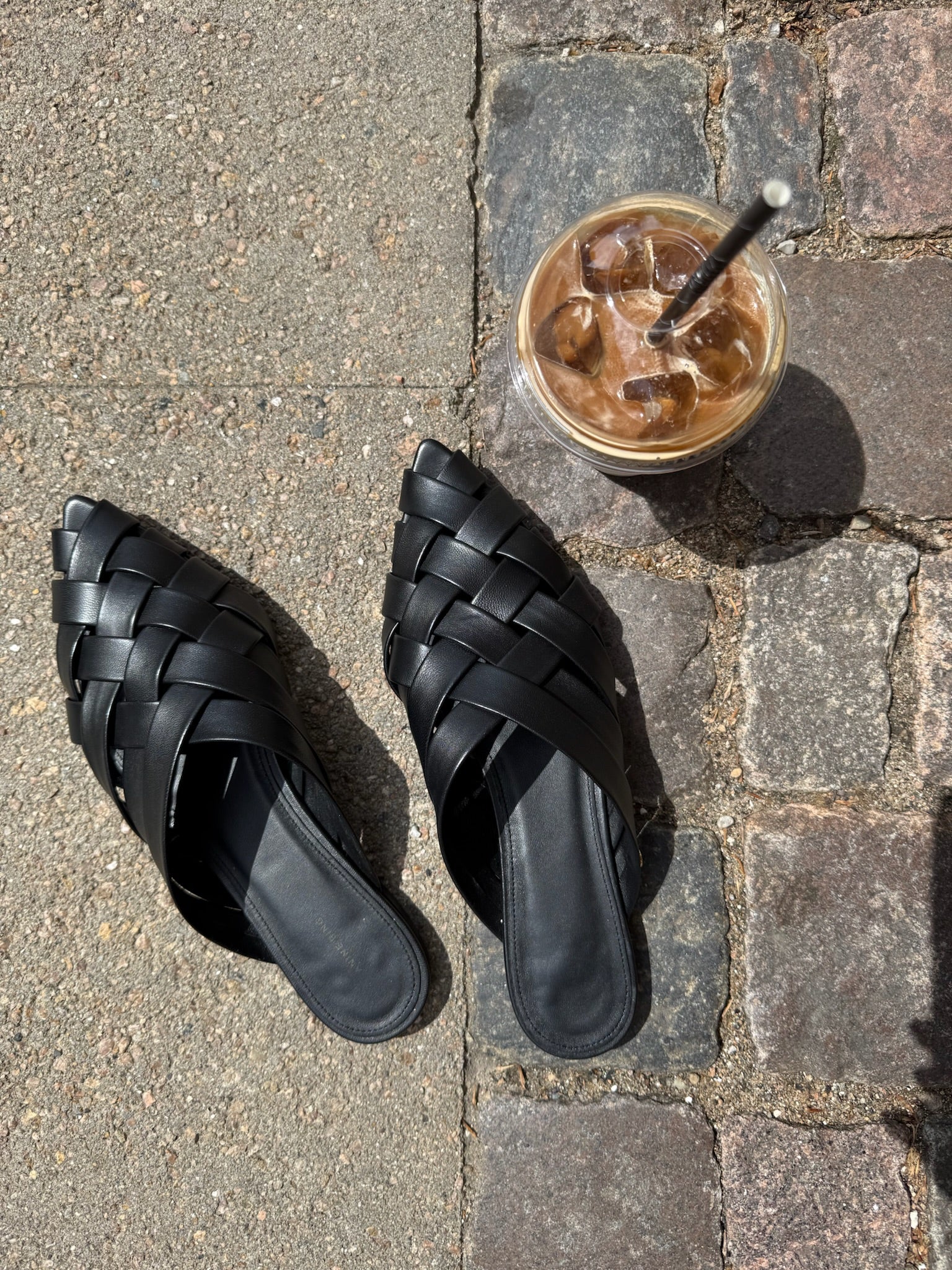 En flettet slip-on sandal med flade remme, fremstillet af glat 100% sort læder. Designet har en diskret spids snude og bløde, polstrede remme, der giver både stil og komfort. Indersålen er let polstret for ekstra støtte, mens ydersålen i højglanslæder tilføjer et elegant touch. Sandalen fuldendes med guldfarvet monogramdetalje som en raffineret finish.