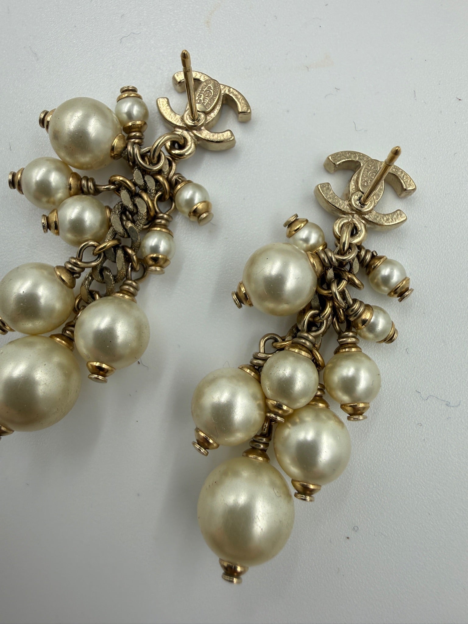 Smukke Chanel-øreringe med et eksklusivt og klassisk udtryk. Øreringene er designet med det velkendte CC-emblem i guldfarvet metal, som danner udgangspunkt for en klynge af elegante, imiterede perler i flere størrelser. De fine kæder giver bevægelse til perlerne og skaber et raffineret, luksuriøst look med liv og dybde.
