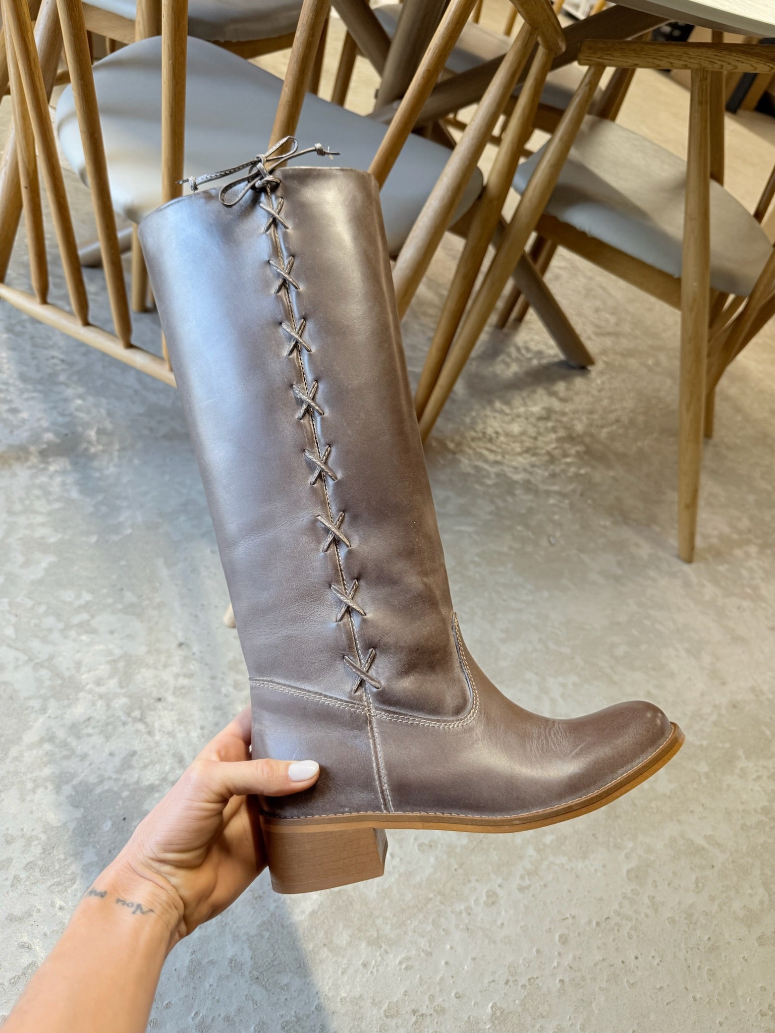 Håndlavet støvle fra portugisiske Dico i Escovado-signaturlæder med et højt skaft og afrundet snude. Støvlen har en 45 mm hæl og er fremstillet med fokus på holdbarhed og komfort.