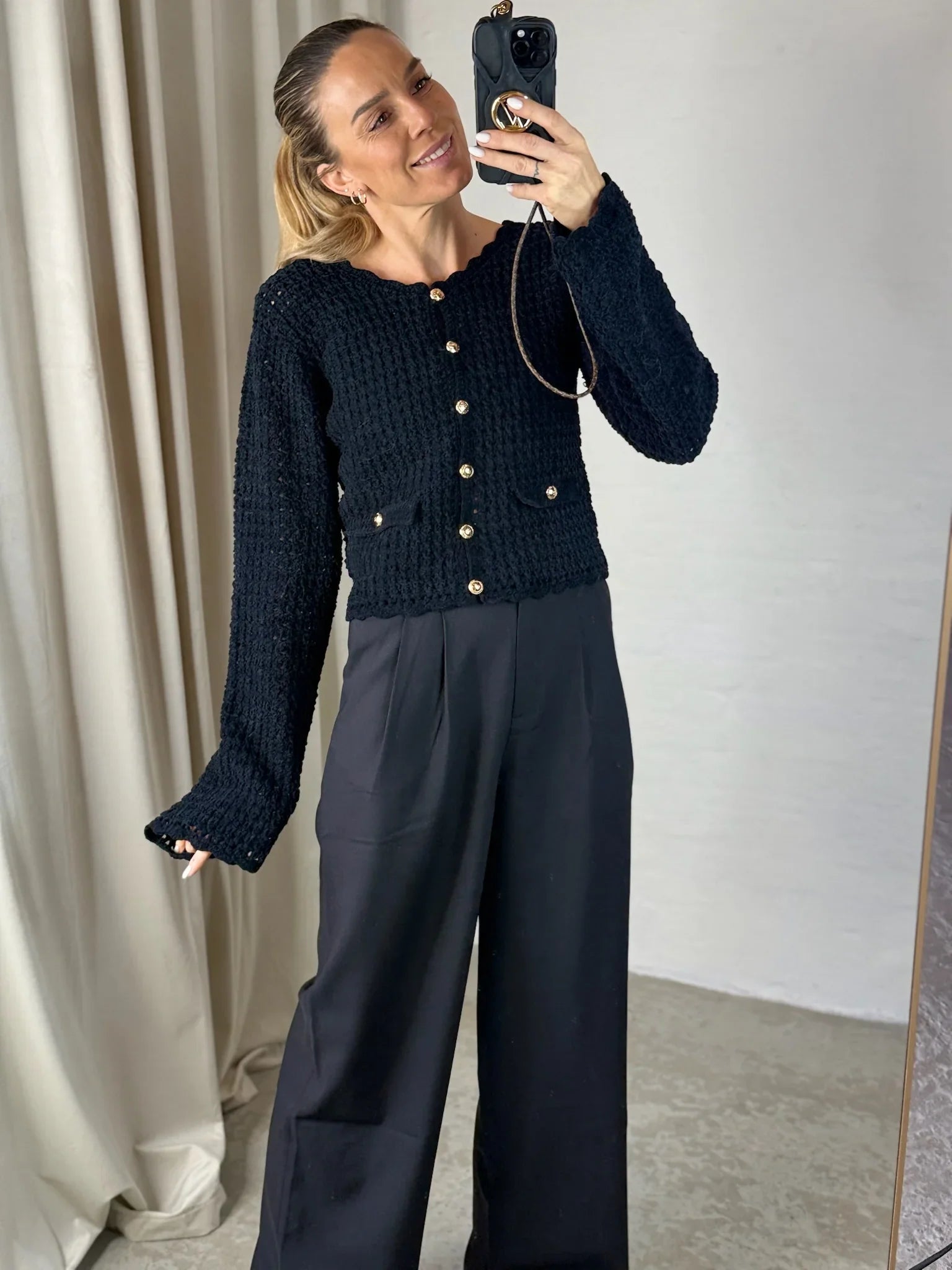 Cardiganen har en klassisk rund halsudskæring med let bølget kant, som går igen ved både håndled og bund. Foran lukkes den med de karakteristiske runde knapper i guld, der giver en eksklusiv kontrast til det mørke materiale. De to frontlommer med matchende knapper fuldender det gennemførte design.