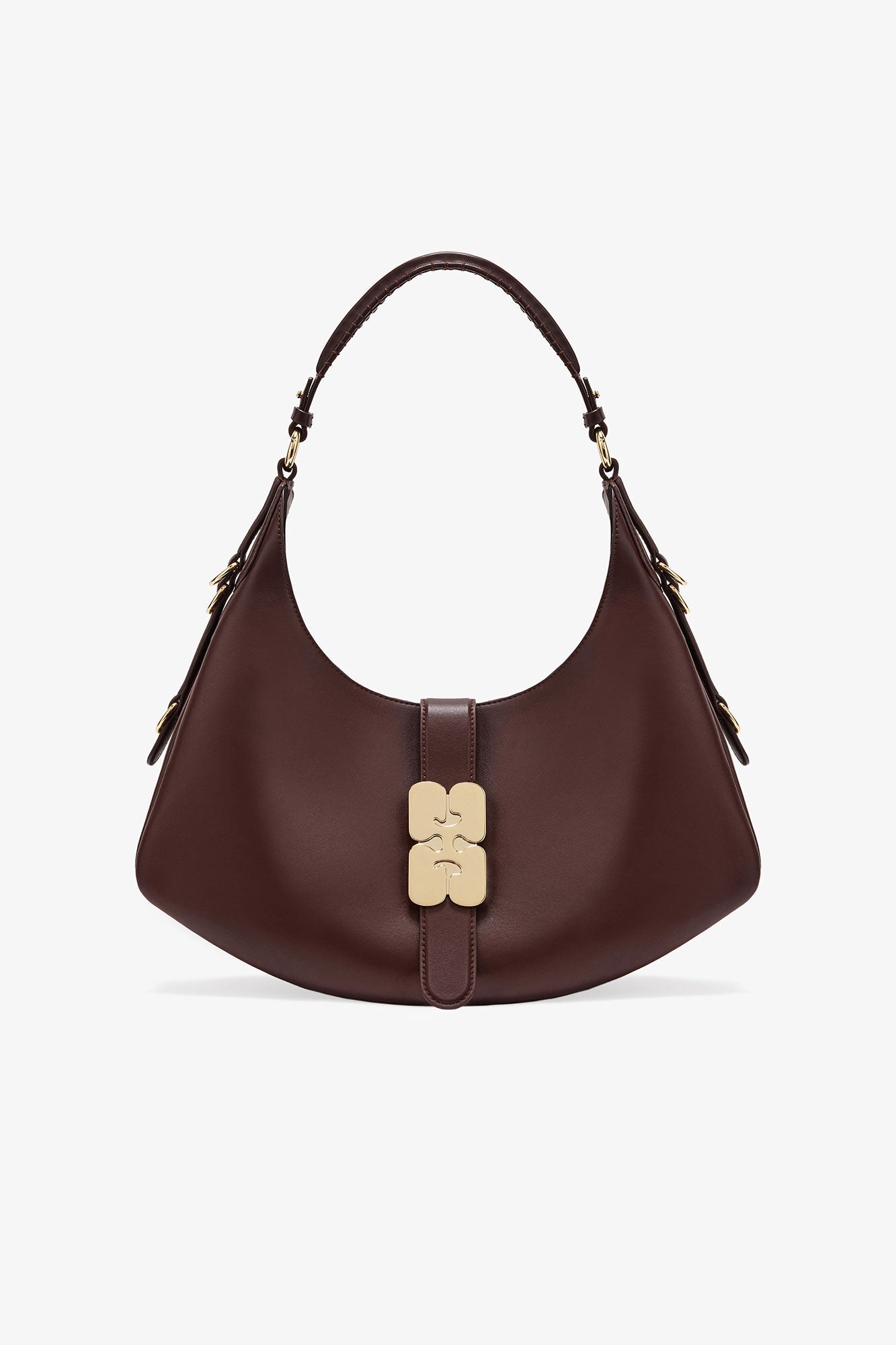 Den bløde, strukturerede form suppleres af en justerbar shoulder strap, elegant D-rings detailing og det ikoniske gold-tone GANNI Butterfly logo, som fungerer som et markant og stilrent blikfang.