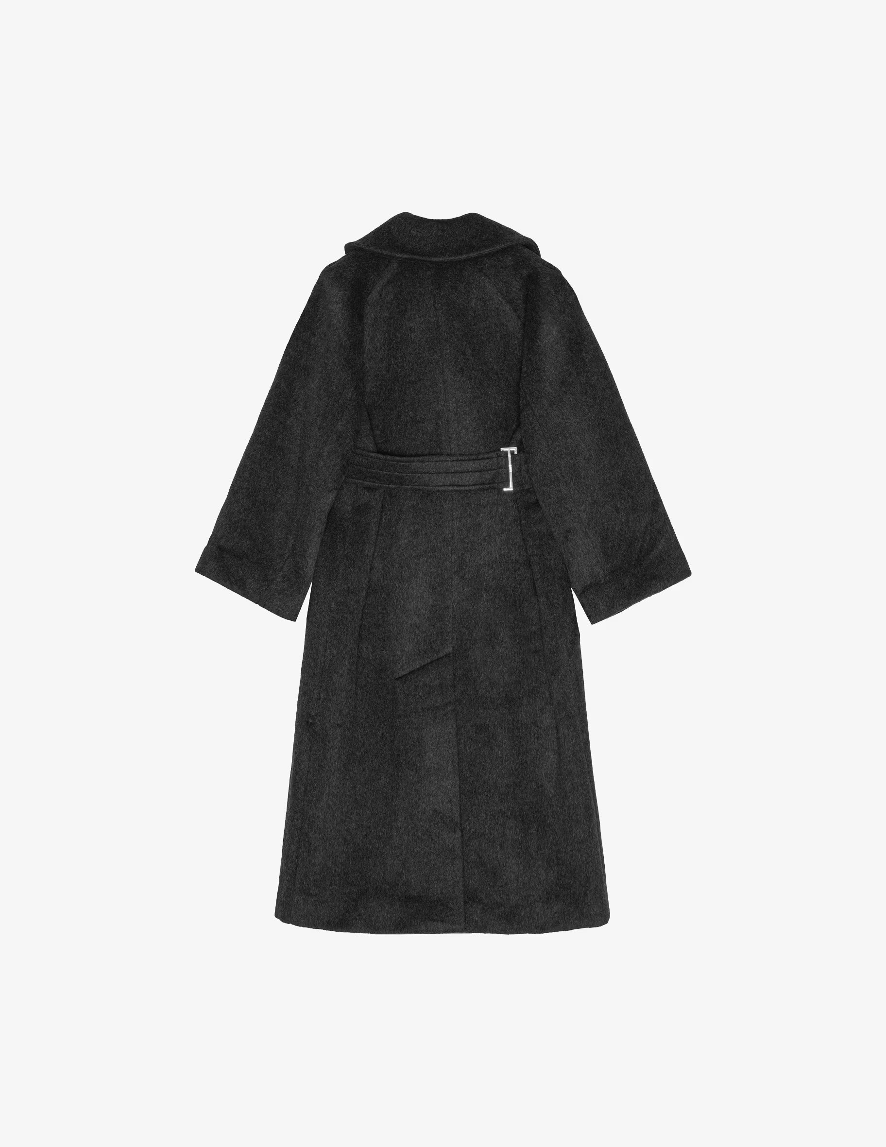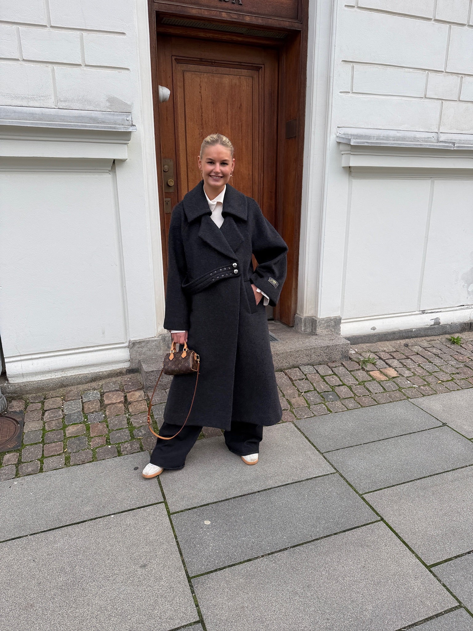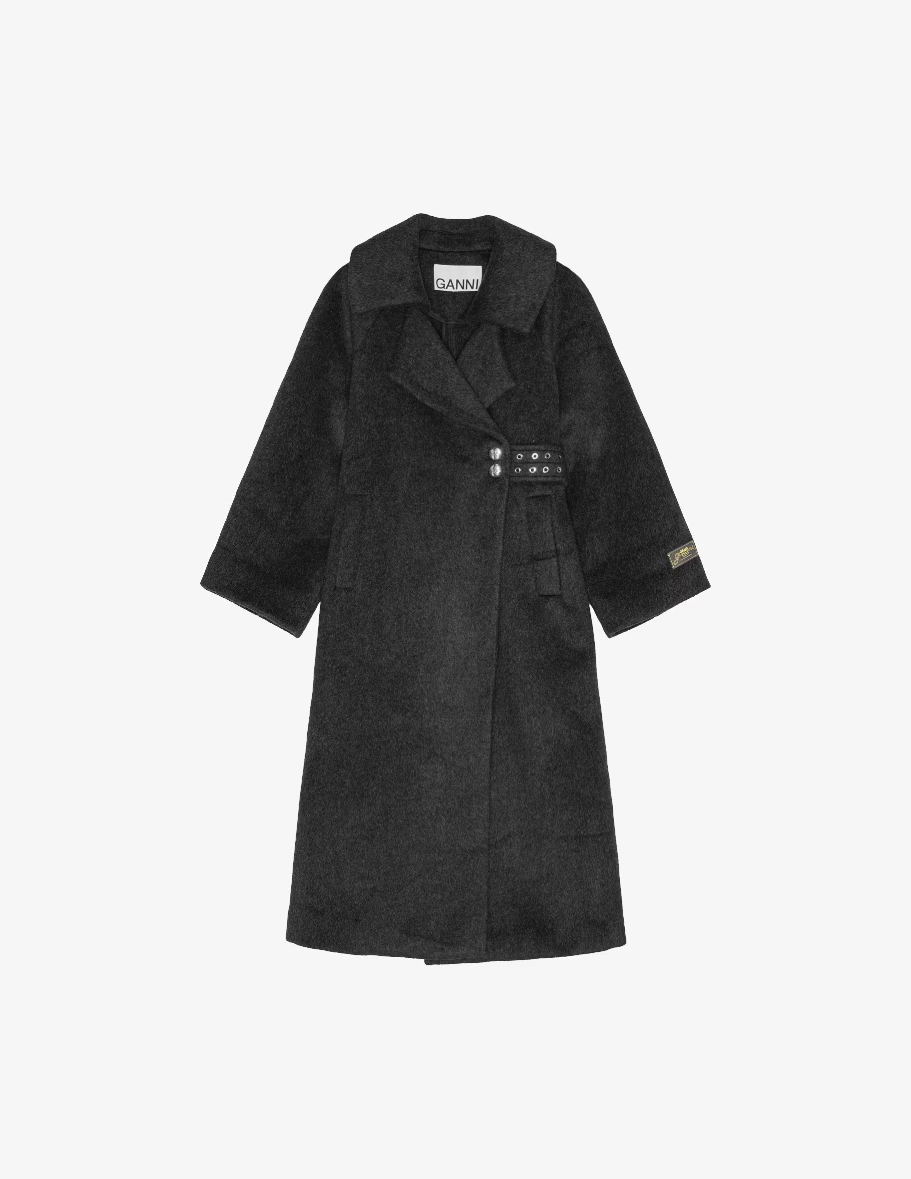 Denne elegante frakke fra Ganni kombinerer moderne minimalisme med klassisk skandinavisk design og er perfekt til dig, der søger både stil og funktion. Den lange silhuet i mørk uld skaber et sofistikeret udtryk, mens de asymmetriske detaljer og dekorative knapper giver jakken et edgy, modebevidst twist. De brede ærmer og den markante krave tilfører ekstra volumen og gør frakken ideel til lag-på-lag styling i de kolde måneder.