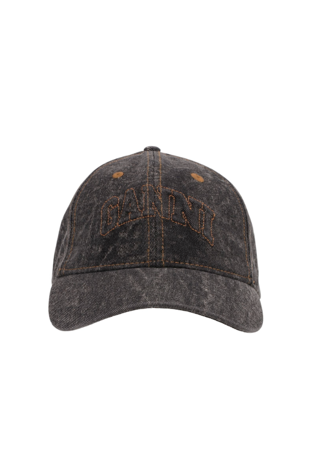 Det vaskede sorte canvas-materiale giver kasketten et cool, casual udtryk. De synlige kontrastsyninger tilføjer et råt touch, mens det broderede GANNI-logo på fronten understreger det moderne, skandinaviske design.