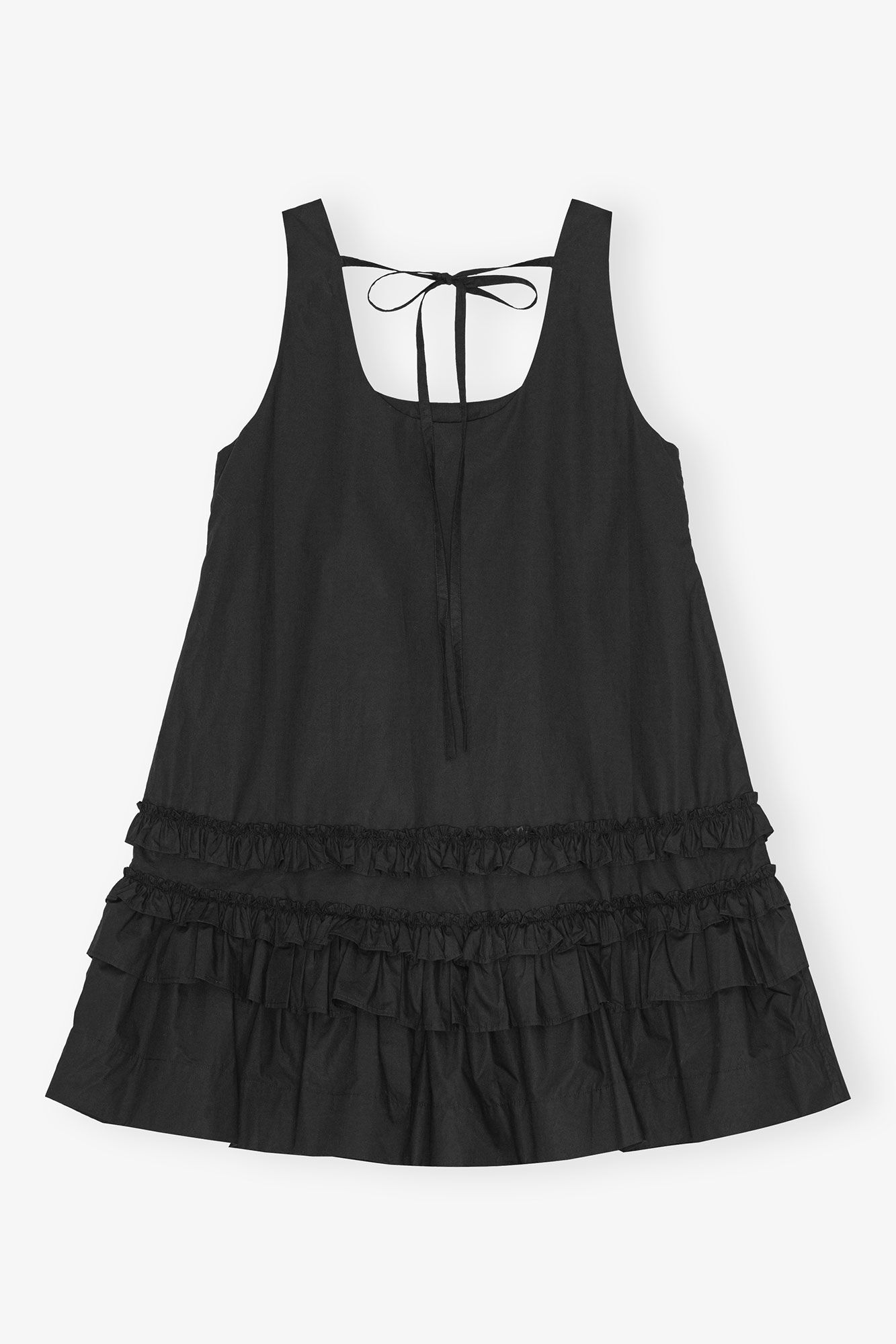 Denne minikjole har en U-formet halsudskæring, en flæsekant og en åben ryg med bindelukning