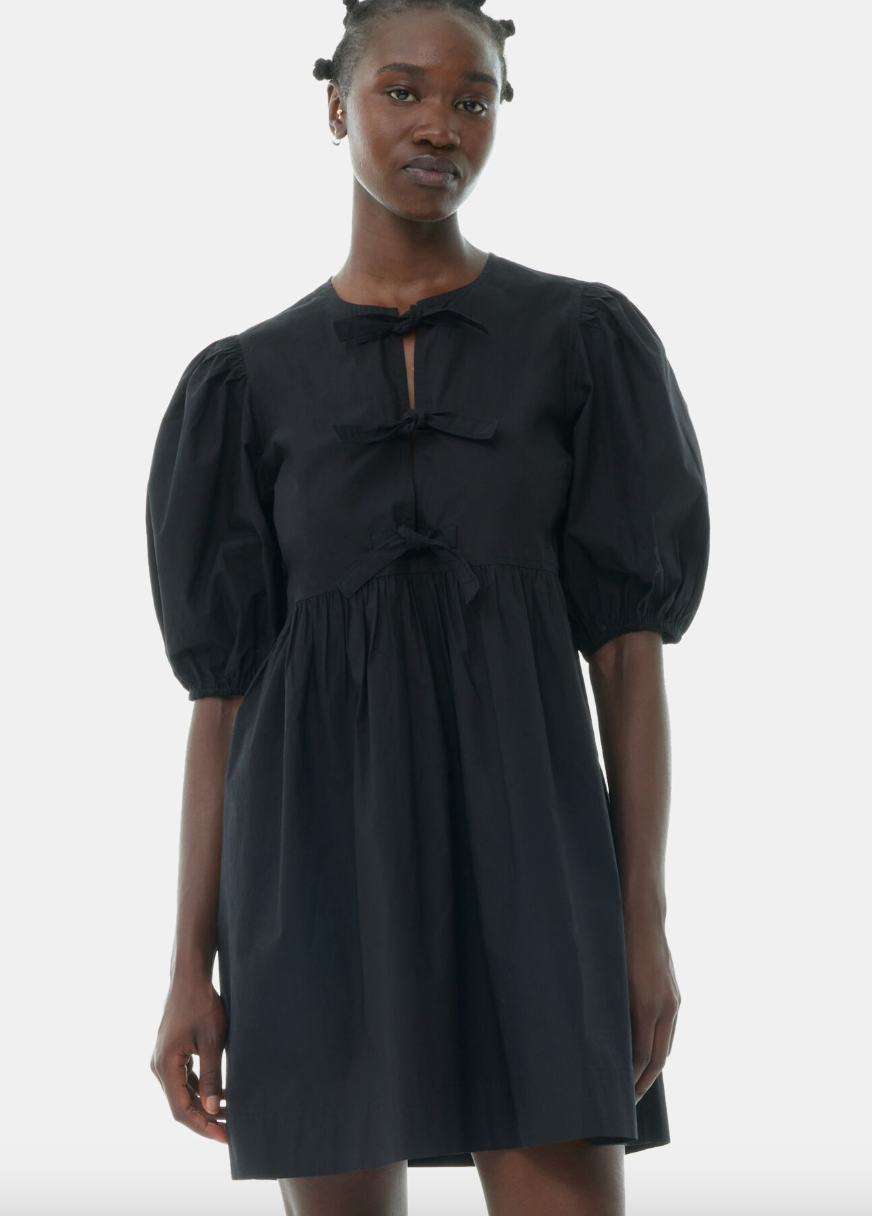 En fin sort kjole fra Ganni. Kjolen har korte ballon ærmer og bindes med 3 sløjfer foran.
