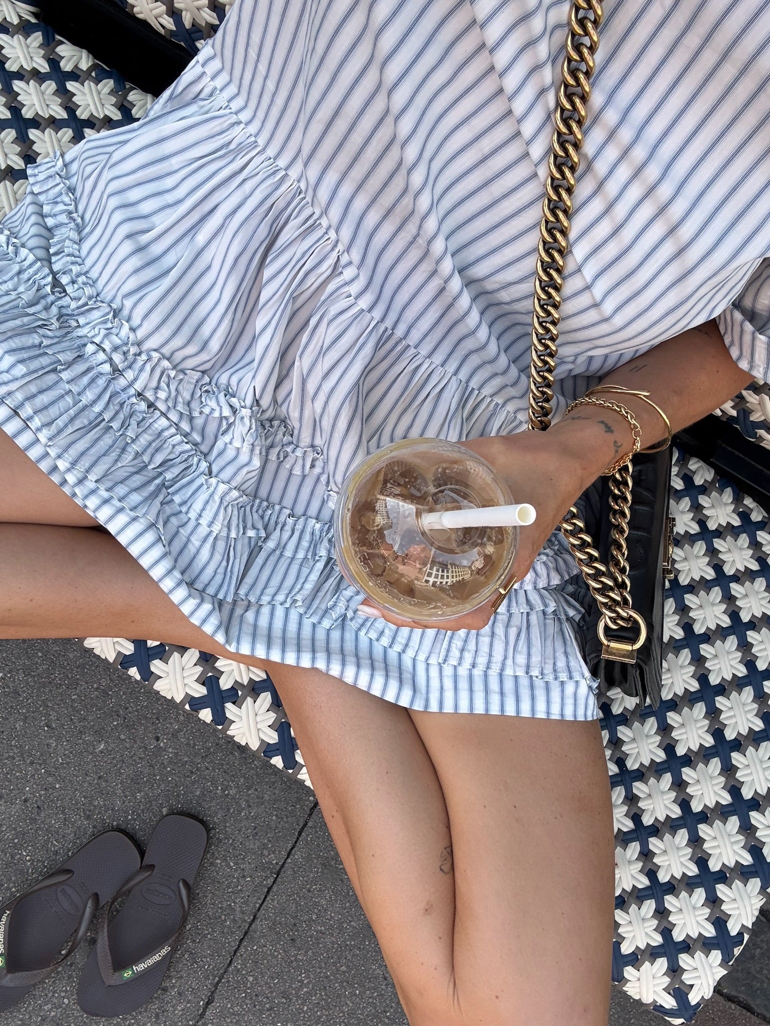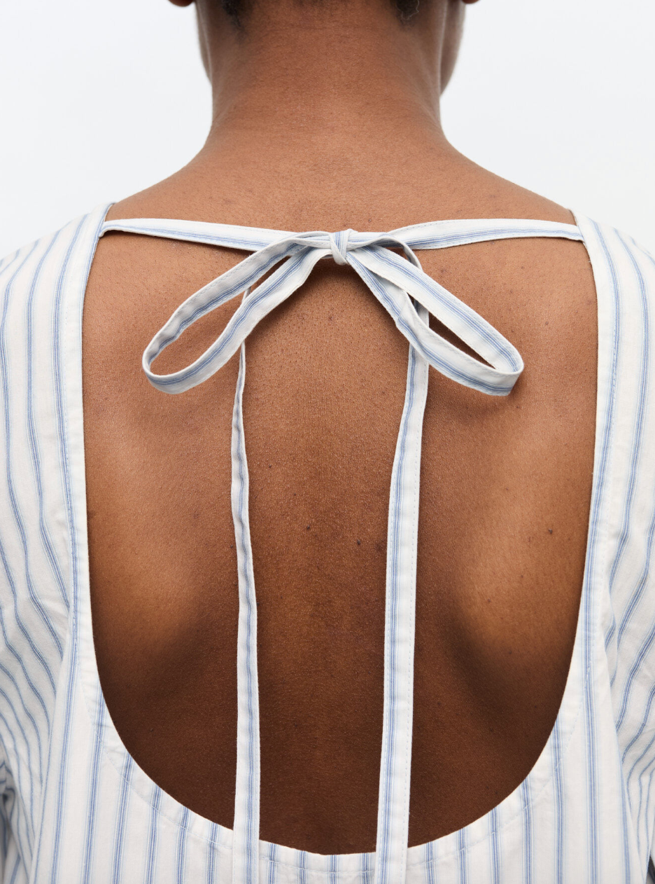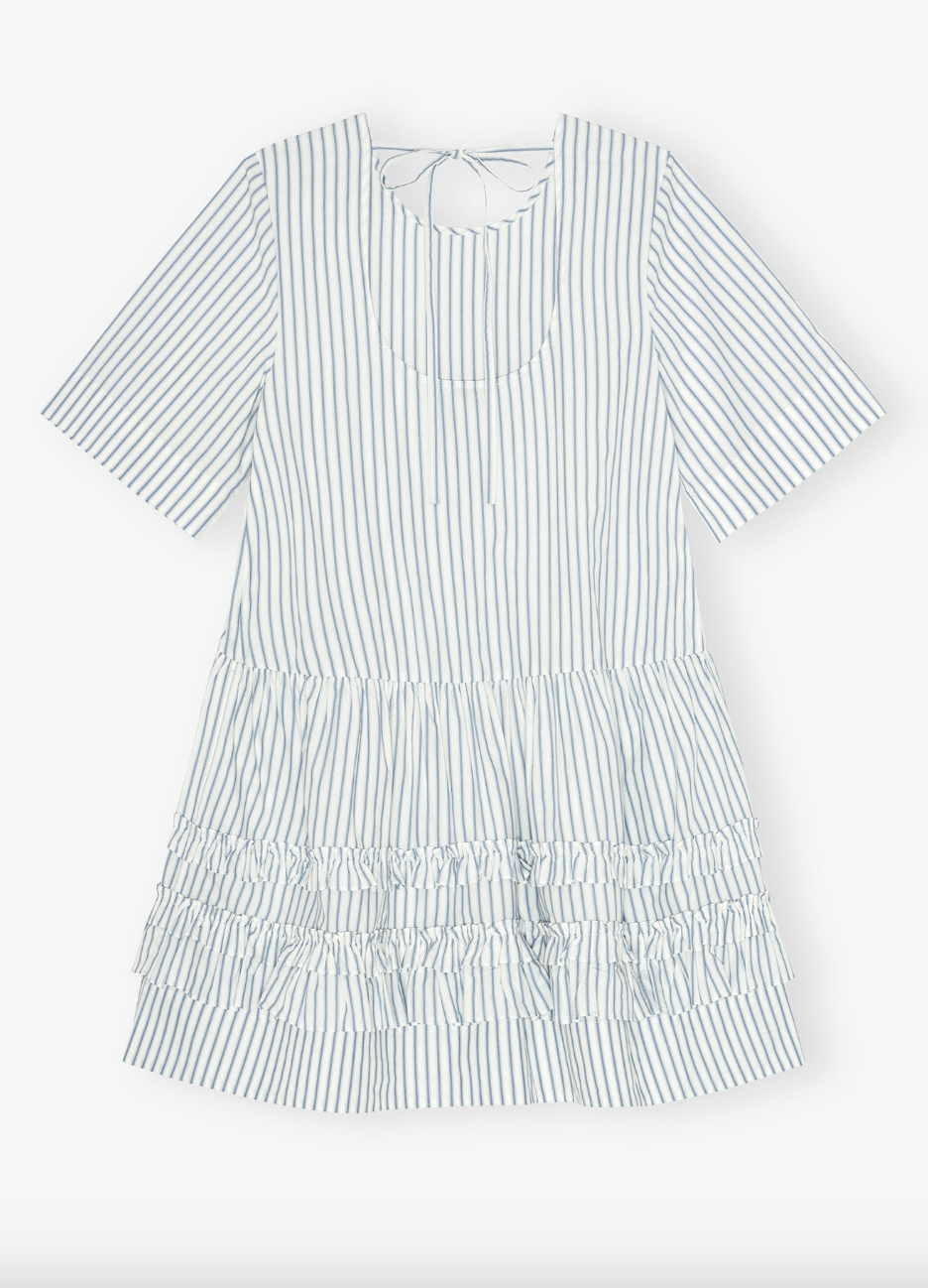 Denne kjole er lavet af 100 % økologisk bomuld og har et charmerende hvid- og blåstribet mønster. Den er designet med en rund halsudskæring, korte ærmer og et legende skørt med flæser i flere lag, der giver et let og luftigt udtryk