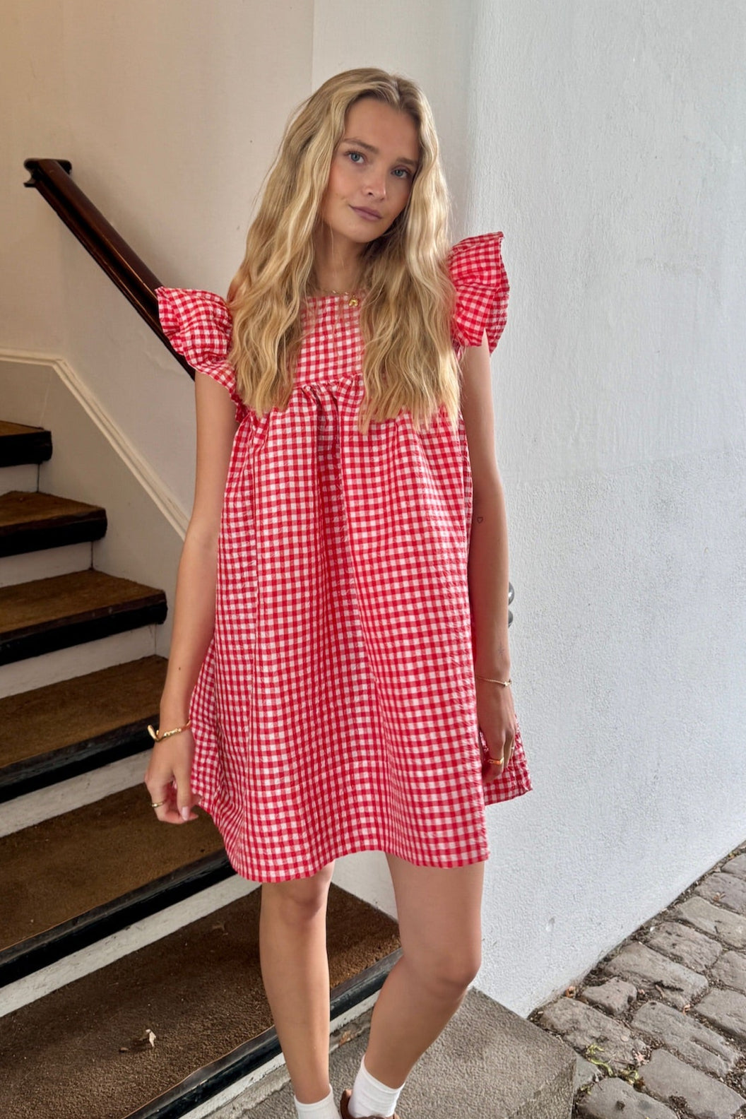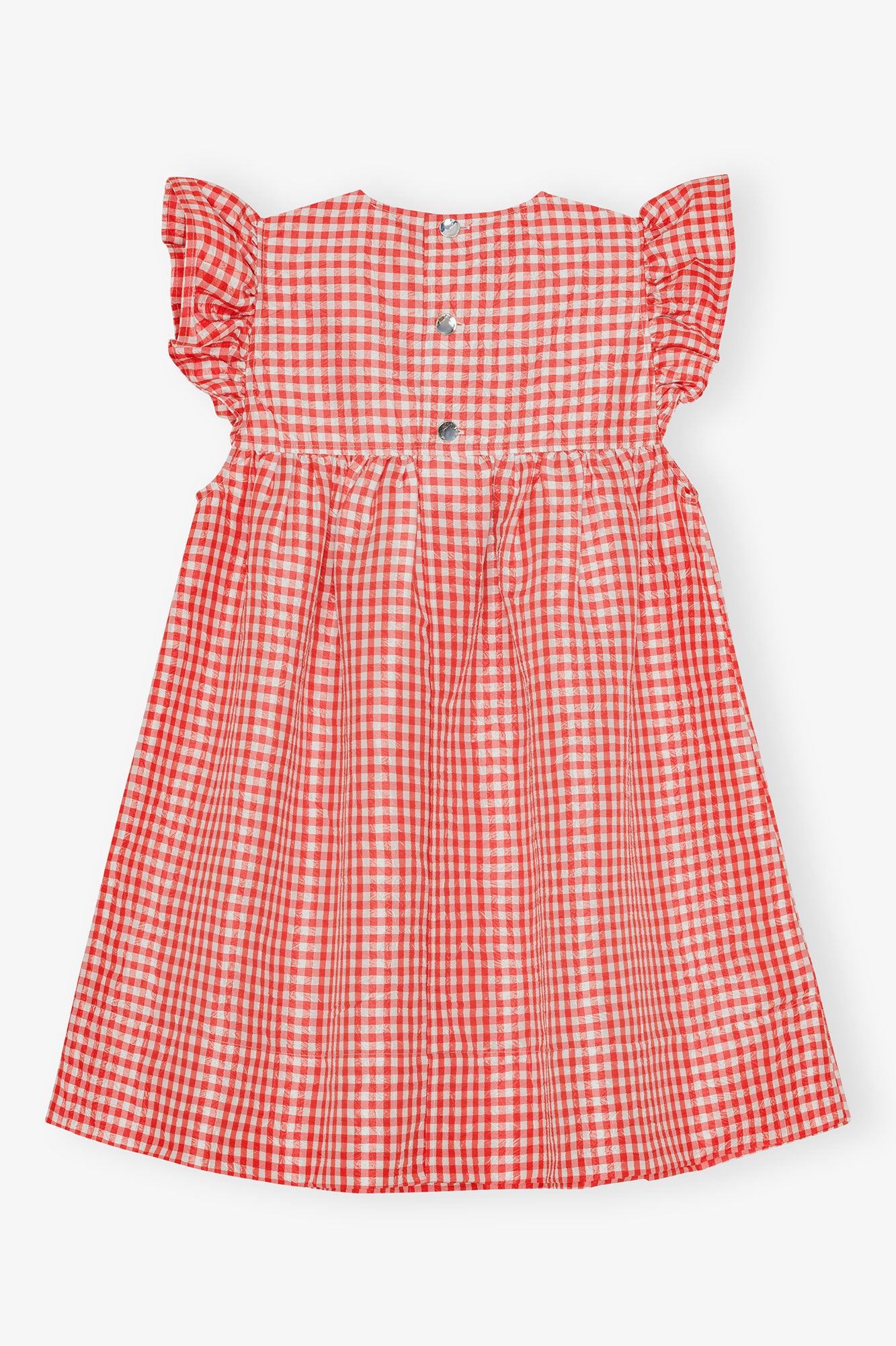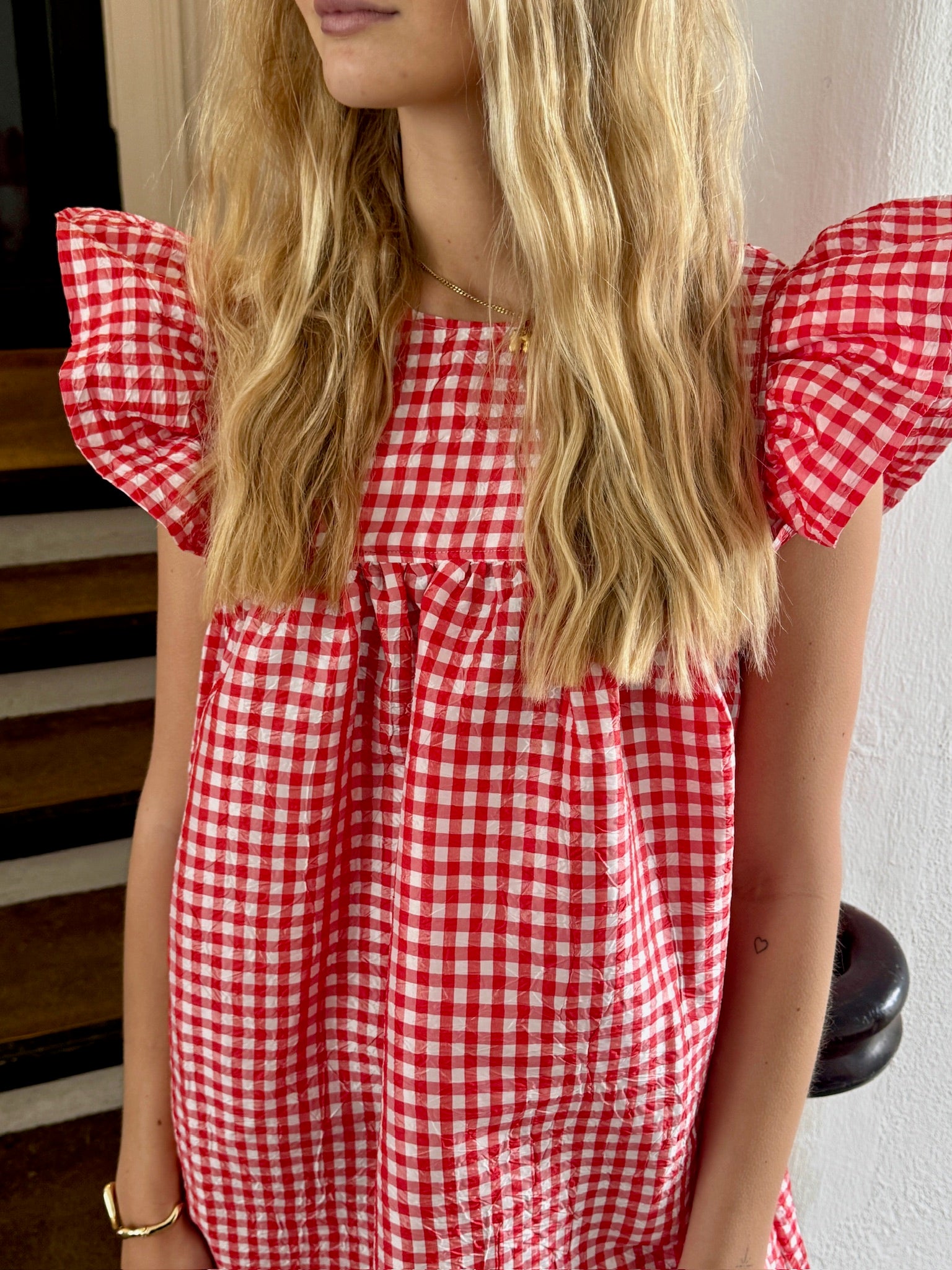Denne minikjole er lavet i et krøllet taftmateriale med et rødt og hvidt ternet mønster. Den har flæsedetaljer på skuldrene og en afslappet silhuet