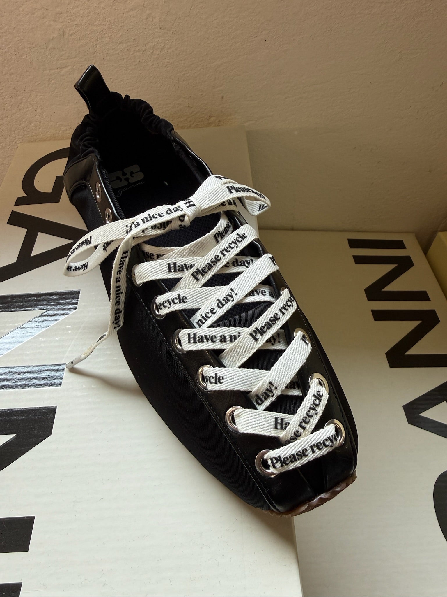 Disse sporty ballerina sko fra Ganni kombinerer komfort og moderne design i et stilrent udtryk. Ballerinaskoene har et snøredesign i slidstærkt nylon, som giver et cool, sneaker-inspireret look, samtidig med at de bevarer den feminine silhuet.