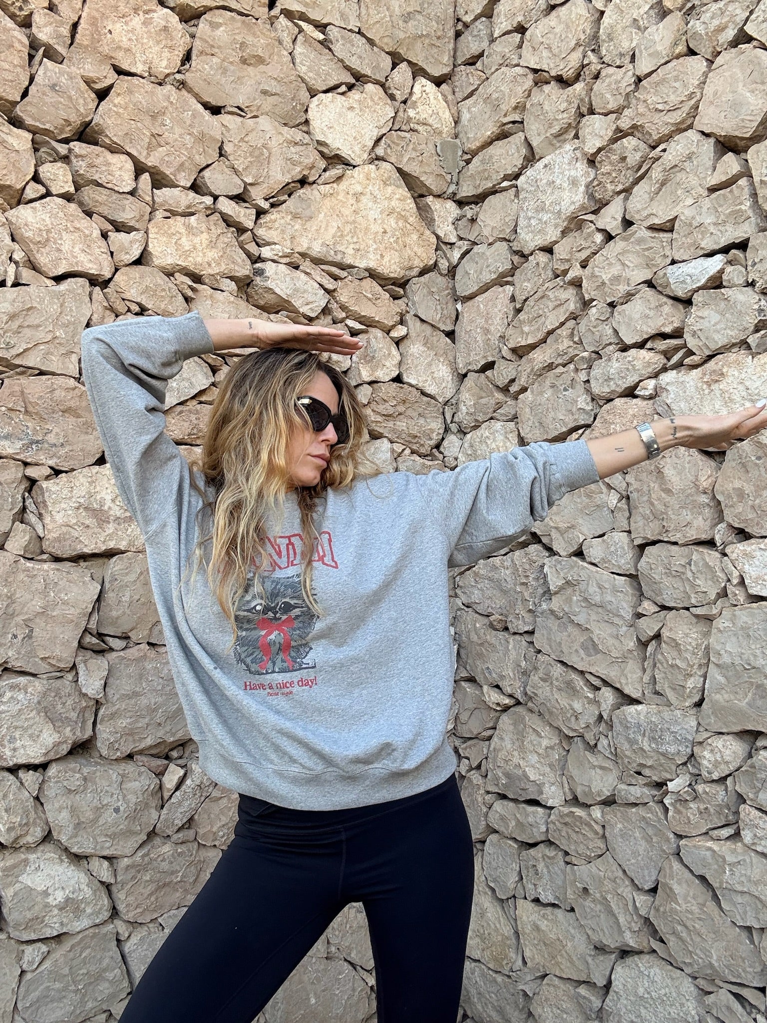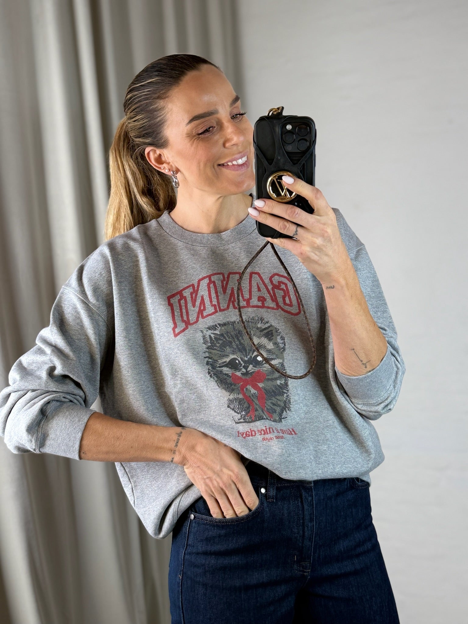 På brystet prydes designet af et stort, grafisk print med GANNI-logoet i en markant rød tone samt en sød, lodden kat illustreret med sløjfe og teksten “Have a nice day!”. Det giver trøjen et legende og genkendeligt Ganni-udtryk, som skiller sig ud uden at blive for meget.