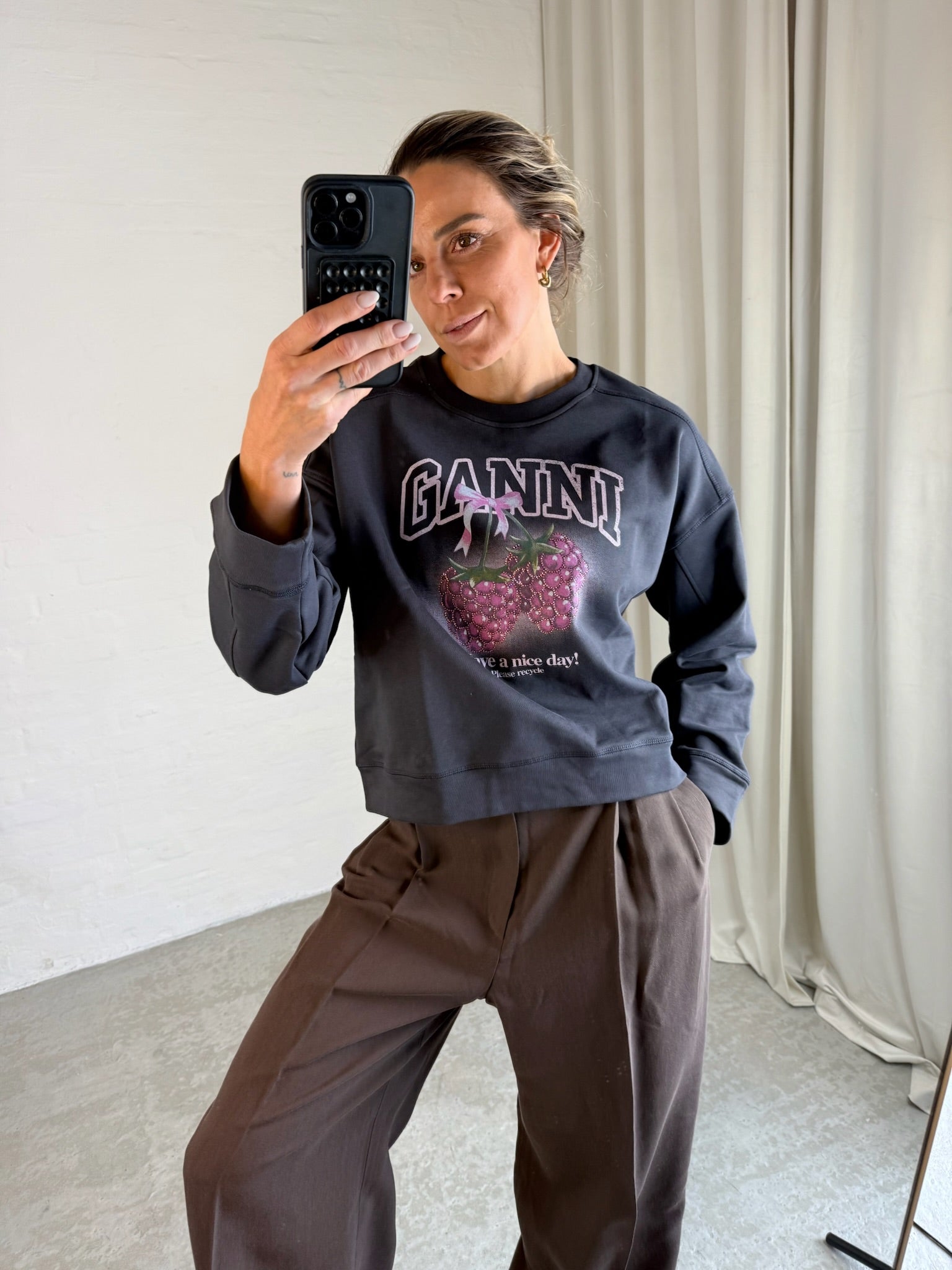 Sweatshirt fra GANNI i farven mørkegrå (Phantom) med et markant og legende frontprint. Designet har et stort GANNI-logo i collegiate-stil samt et grafisk motiv af lyserøde kirsebær bundet med en sløjfe. Kirsebærene er dekoreret med små lyserøde perler, som giver printet et let glitrende og feminint udtryk. Under motivet står teksten “Have a nice day! Please recycle.”