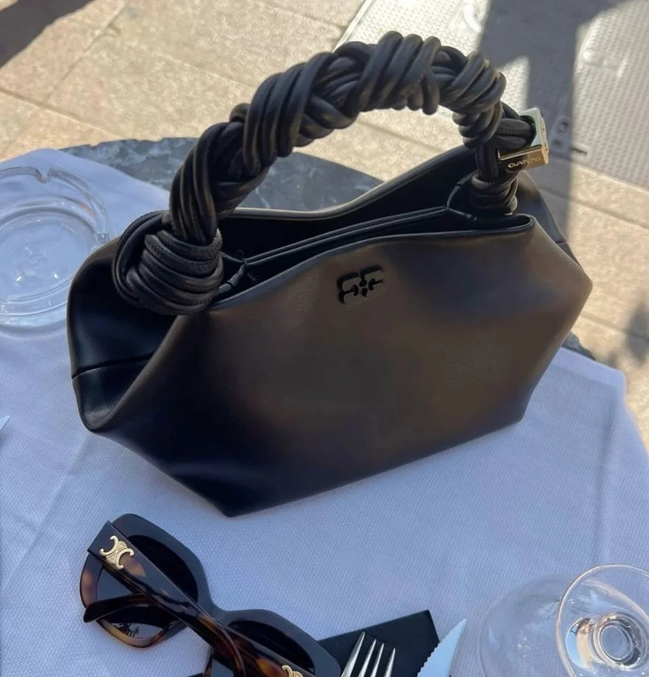 Denne sorte mini GANNI Bou Taske har et tone-i-tone metallisk GANNI Butterfly-logo, et snoet håndtag med et flettet knudepunkt og en guldfarvet metallisk terning med et indgraveret GANNI Butterfly-logo. Tasken har en intern magnetlukning, en flad kortlomme indeni og en justerbar og aftagelig skulderrem til brug som crossbody.