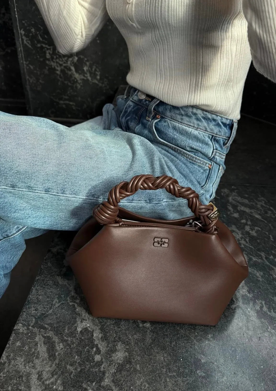 Denne stilfulde GANNI taske kombinerer moderne design med eksklusive detaljer. Tasken prydes af et elegant tone-i-tone metallisk Butterfly-logo, et snoet håndtag med en smukt flettet knude og en guldfarvet terning med det ikoniske GANNI-logo indgraveret. Den lukkes nemt med en magnetisk tryklås og har et praktisk fladt kortrum indvendigt. Med den justerbare og aftagelige skulderrem kan du bære tasken som crossbody eller over skulderen – perfekt til både hverdag og aftenbrug.