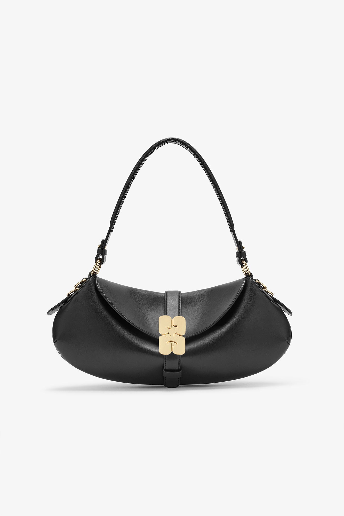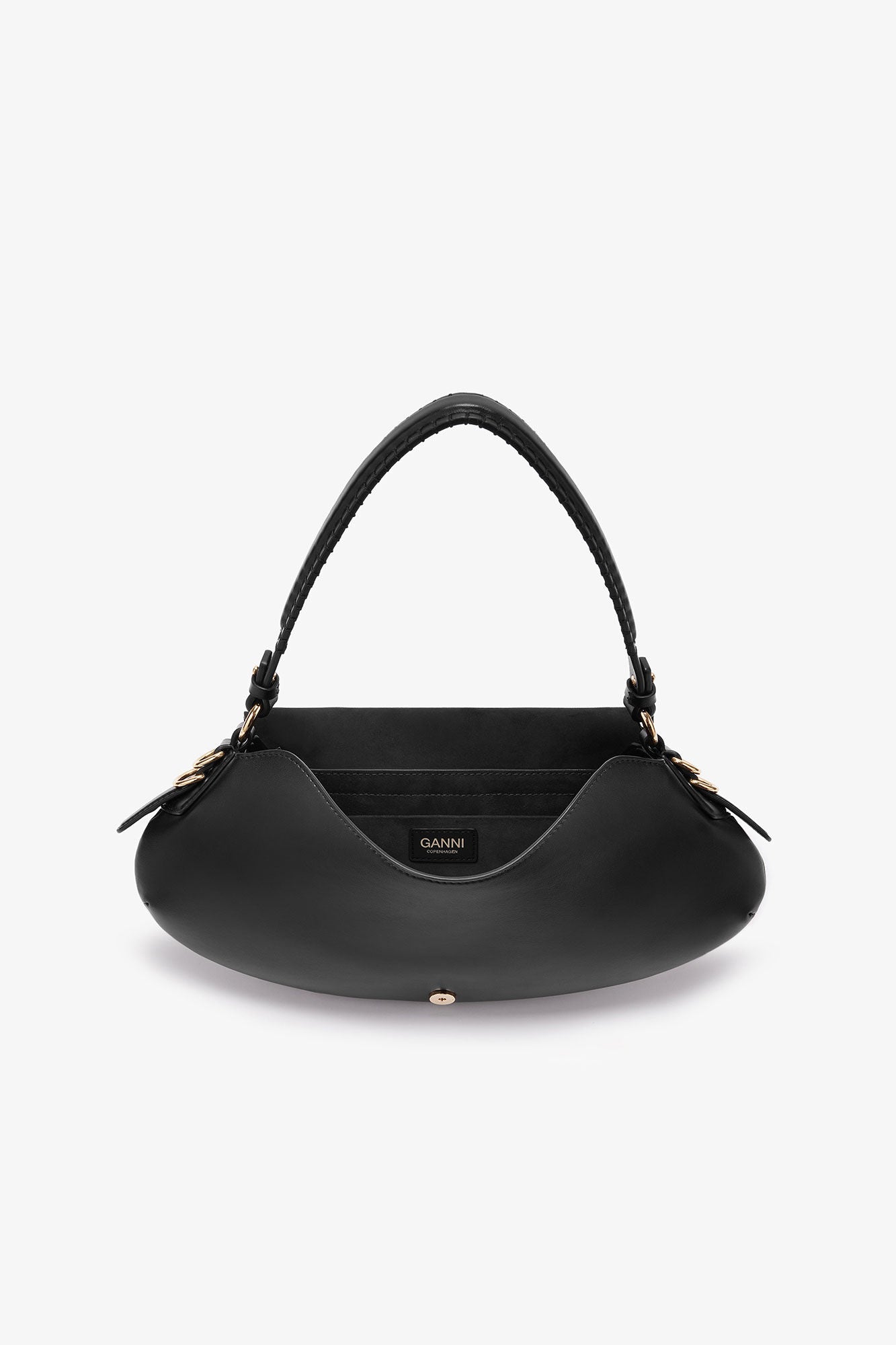 GANNI B-Kat tasken er en stilren skuldertaske med en elegant buet silhuet, der giver et moderne og feminint udtryk. Tasken lukkes med en klaplukning prydet af det ikoniske GANNI Butterfly-logo, som tilfører et eksklusivt touch. Den praktiske skulderrem og de dekorative D-ringdetaljer på siden gør tasken både funktionel og trendy.