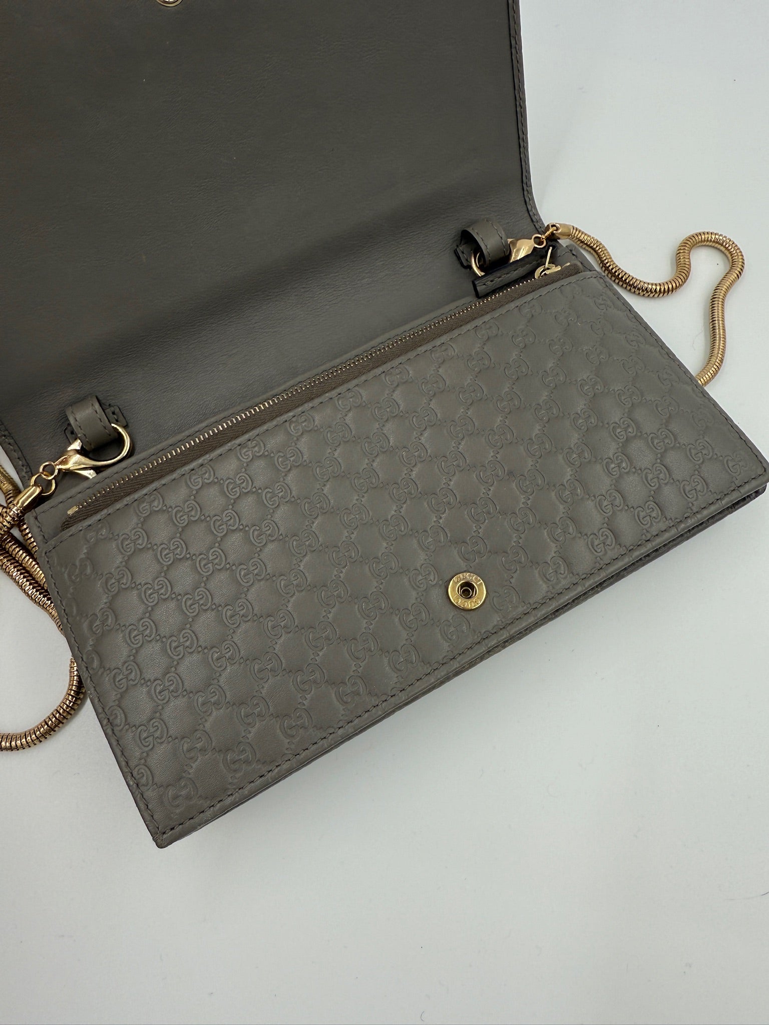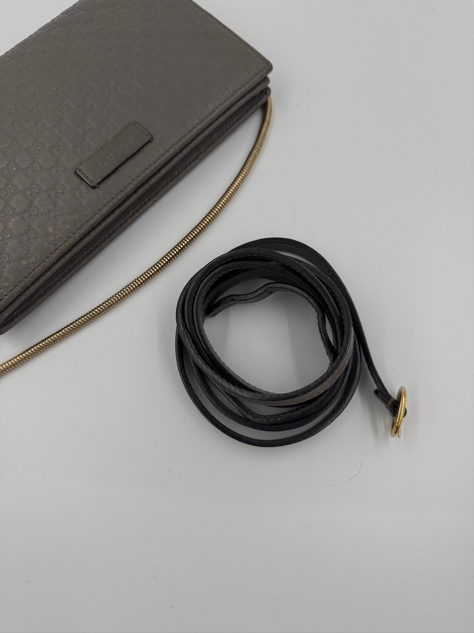 Denne Gucci Microguccissima pung er fremstillet i eksklusivt, præget læder i en elegant mørkegrå/antracit nuance. Det karakteristiske Gucci-mønster giver pungen et diskret, men luksuriøst udtryk. Indvendigt byder den på en funktionel opdeling med lynlåslomme, som gør den velegnet til både kort, sedler og små personlige ejendele. Den aftagelige guldfarvede kæde gør det muligt at bære pungen som clutch eller crossbody, alt efter behov. Et stilrent og klassisk Gucci-accessory, der kombinerer design, kvalitet og funktionalitet.