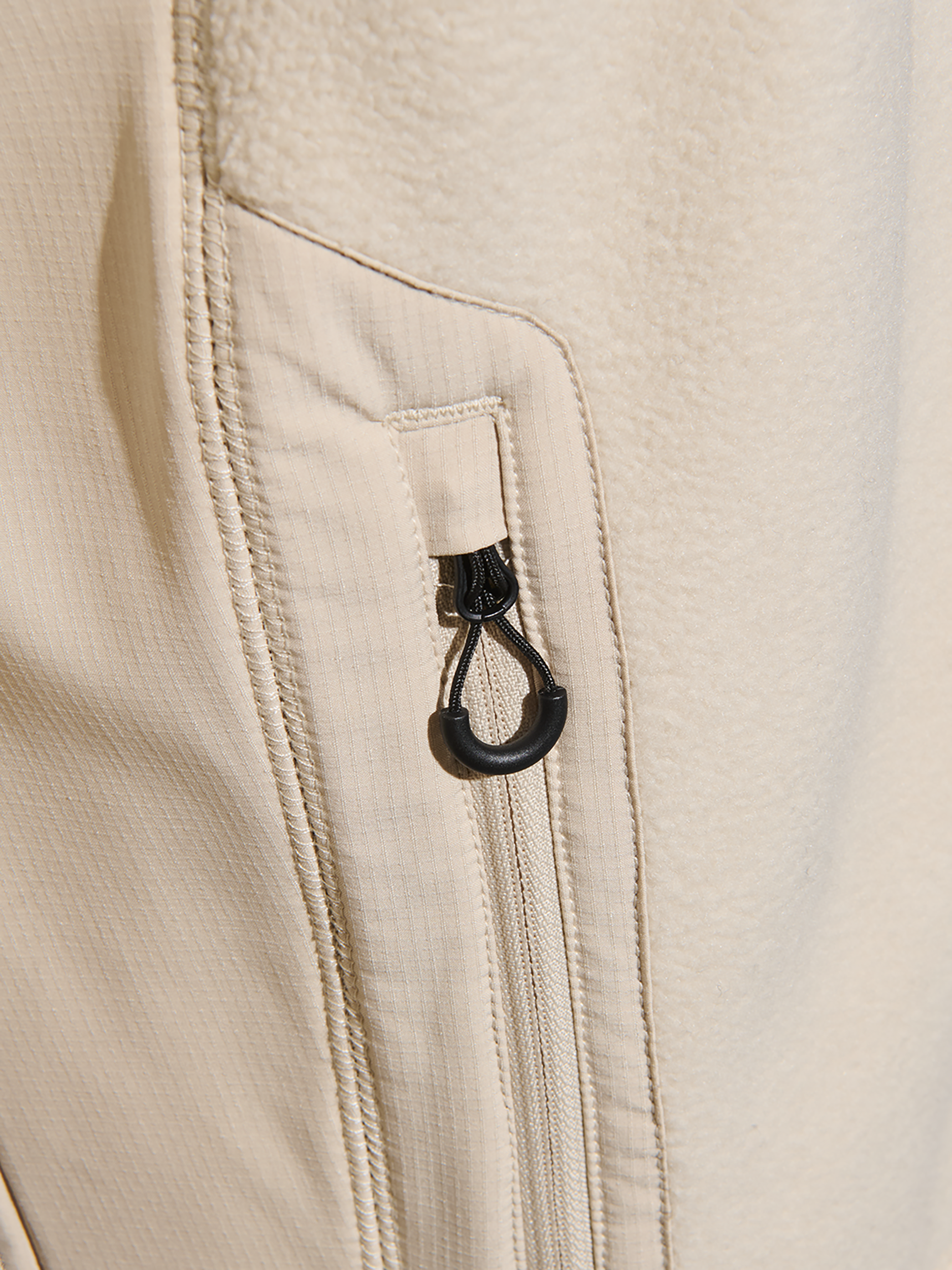 Fronten lukkes med en gennemgående lynlås, og den høje krave med hagebeskyttelse sørger for ekstra komfort på kolde dage. Jakken er afsluttet med flade flatlocksømme ved både ærmer og bund, som giver et pænt og fleksibelt look. Indersiden er let foret, og nederste kant kan justeres, så pasformen kan tilpasses efter behov.