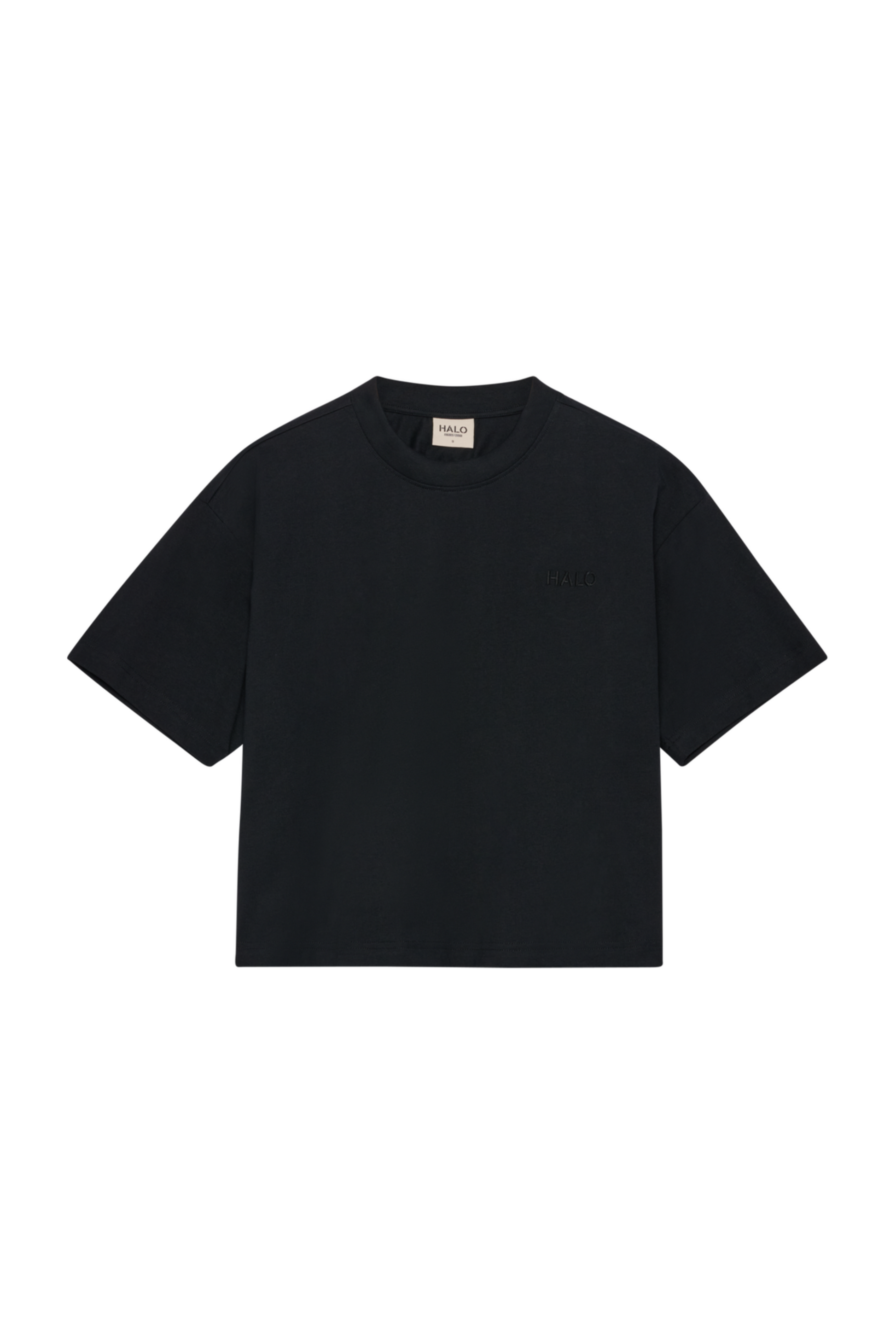 Den sorte HALO WOMEN LOGO T-SHIRT er skabt som et solidt fundament i garderoben med fokus på bæredygtighed og komfort. Materialet består af 100% økologisk bomuld i en kraftig 220 g/m² kvalitet, som giver t-shirten en mere eksklusiv og robust fornemmelse.