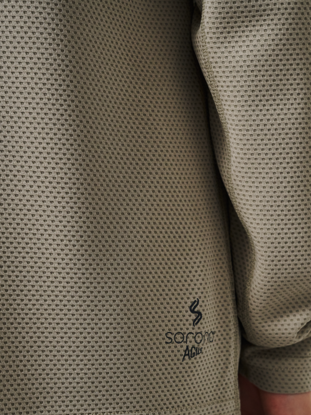 Denne trøje er fremstillet i Sorona® Agile jerseystof – et blødt, elastisk materiale, der både er rynkeresistent og holder formen vask efter vask. Stoffet leder effektivt fugt væk fra kroppen og yder beskyttelse mod UV-stråler, hvilket gør trøjen ideel til både træning og hverdagsbrug.