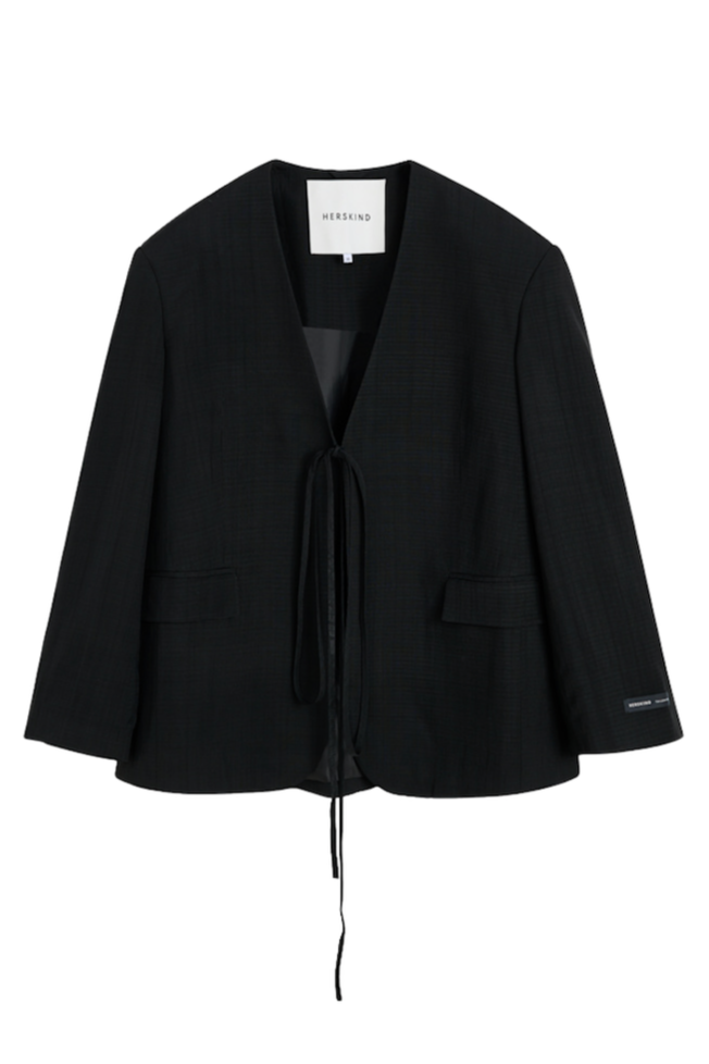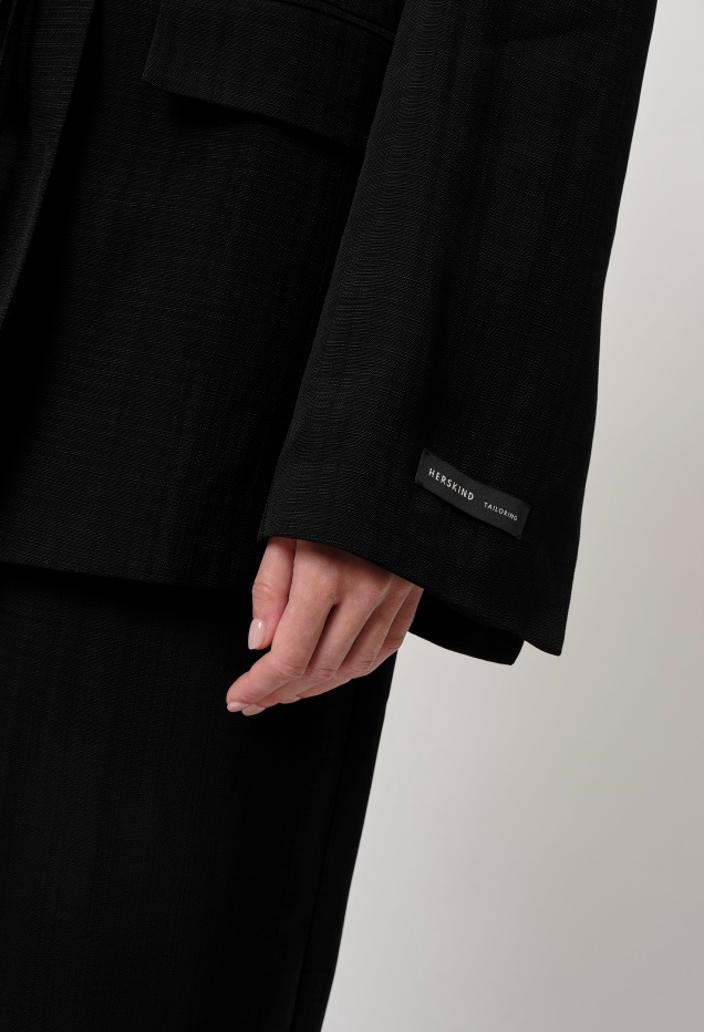 Denne Herskind-blazer kombinerer strukturerede skuldre med en praktisk snøredetalje i taljen. Den oversized pasform og navy melange-farve giver et professionelt udtryk, der passer til kontormiljøer og præsentationer.