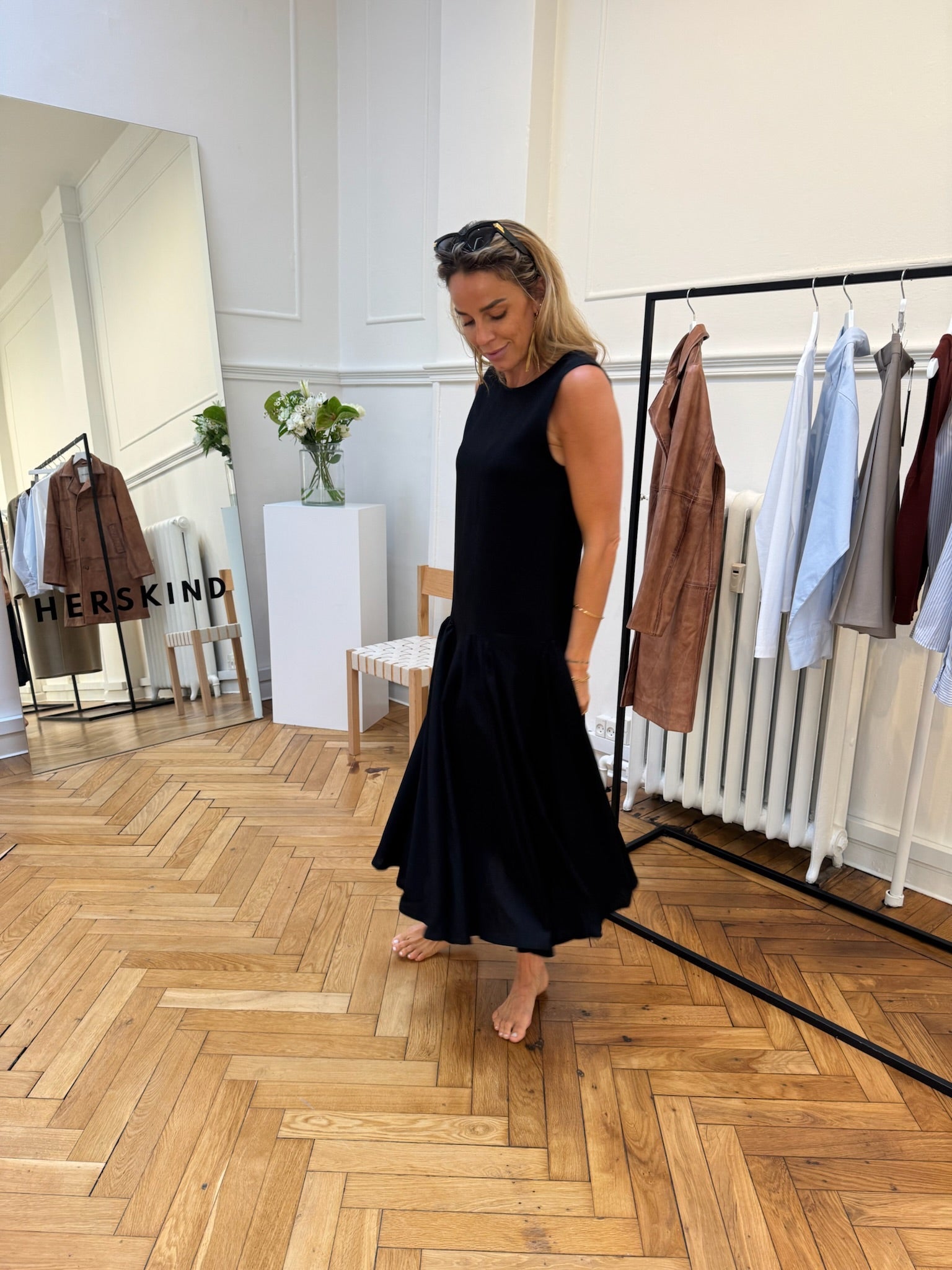 Sebastian Dress i sort fra Herskind er en ærmeløs kjole med et afslappet, langt snit og karakteristiske lave hoftesømme. De diskrete underskørsindsatser skaber blød volumen og elegant bevægelse, som giver kjolen et moderne, minimalistisk udtryk. Silhuetten falder glat mod kroppen med en let glans, der fremhæver den feminine, flydende form.