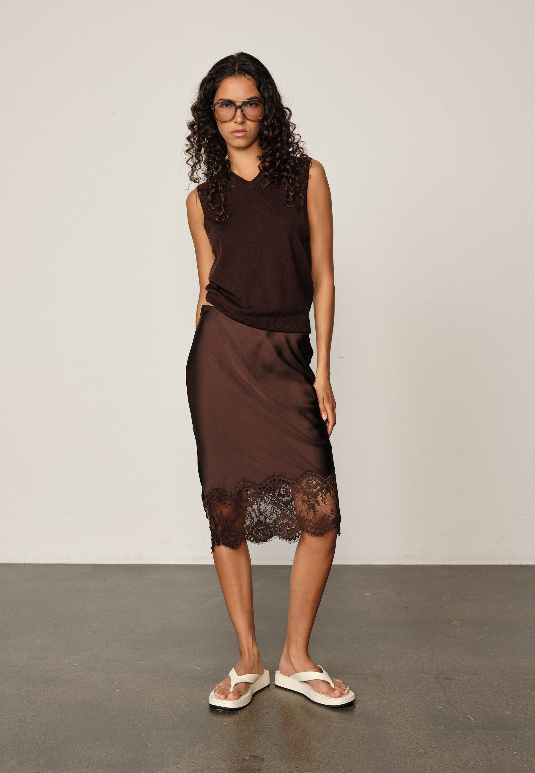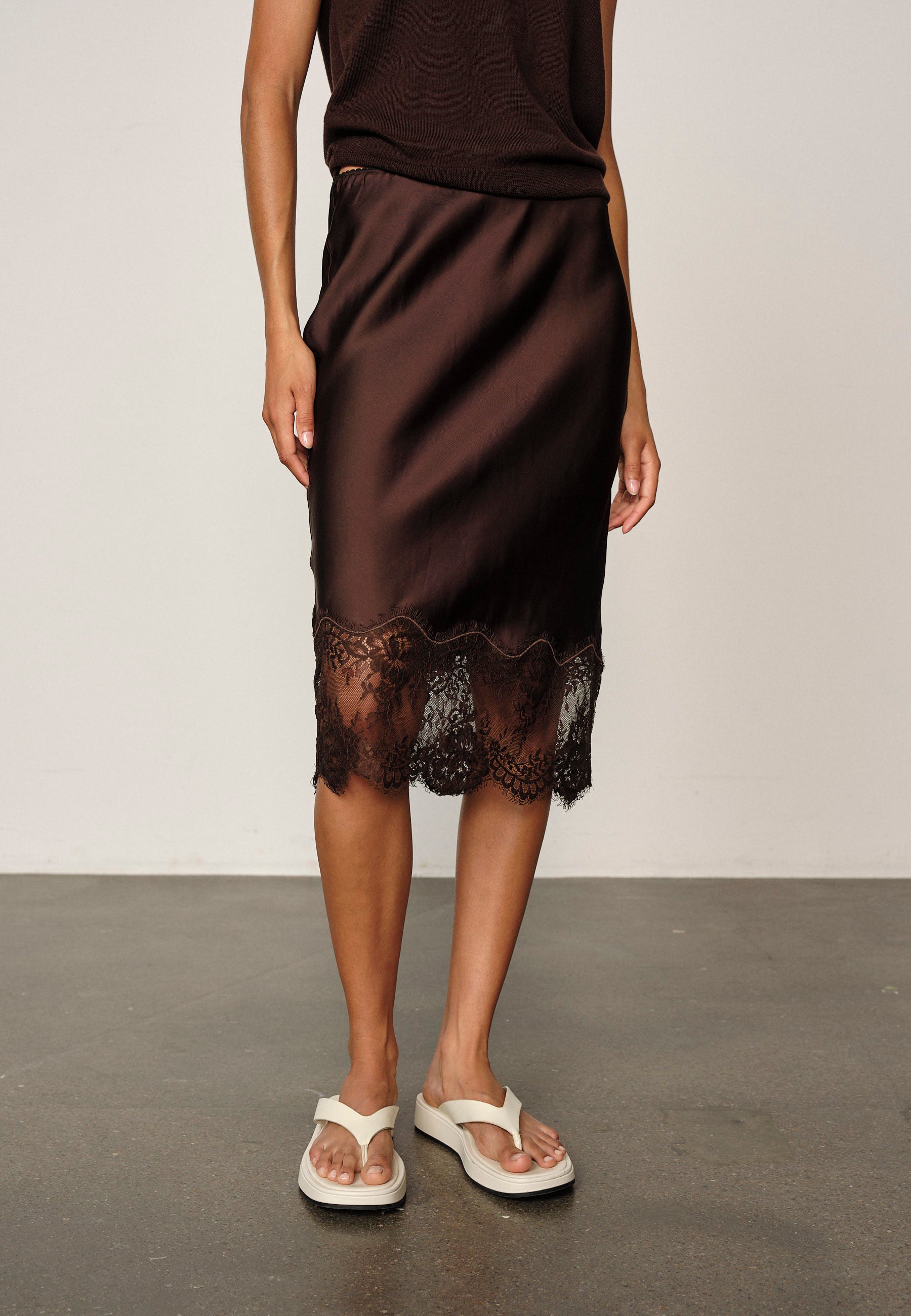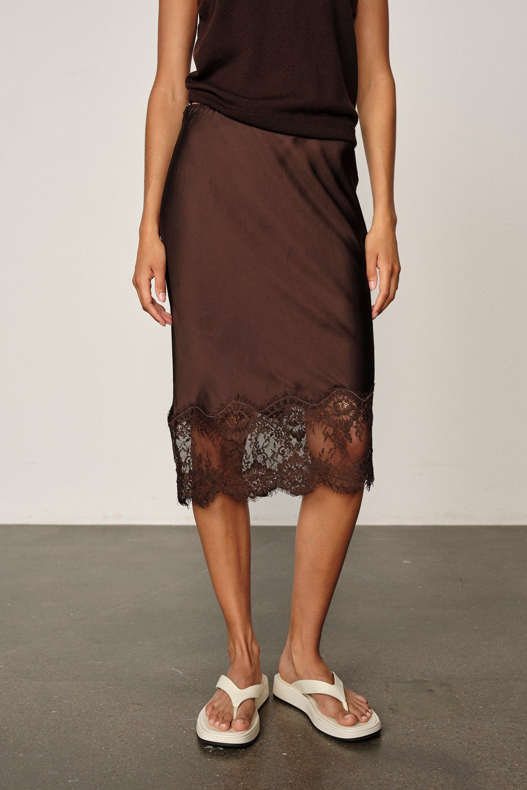 Nederdelen har en blød, let drapering, som giver en smuk silhuet og elegant bevægelse. Den karakteristiske blondekant ved nederdelens afslutning tilføjer et raffineret, tekstureret udtryk, der samtidig giver et strejf af luksus. Det semi-skinnende materiale understøtter den feminine stil og falder flot mod kroppen uden at virke tungt.