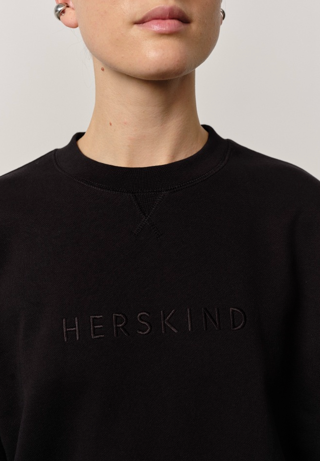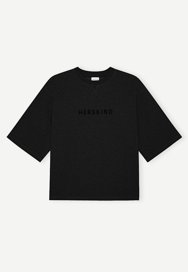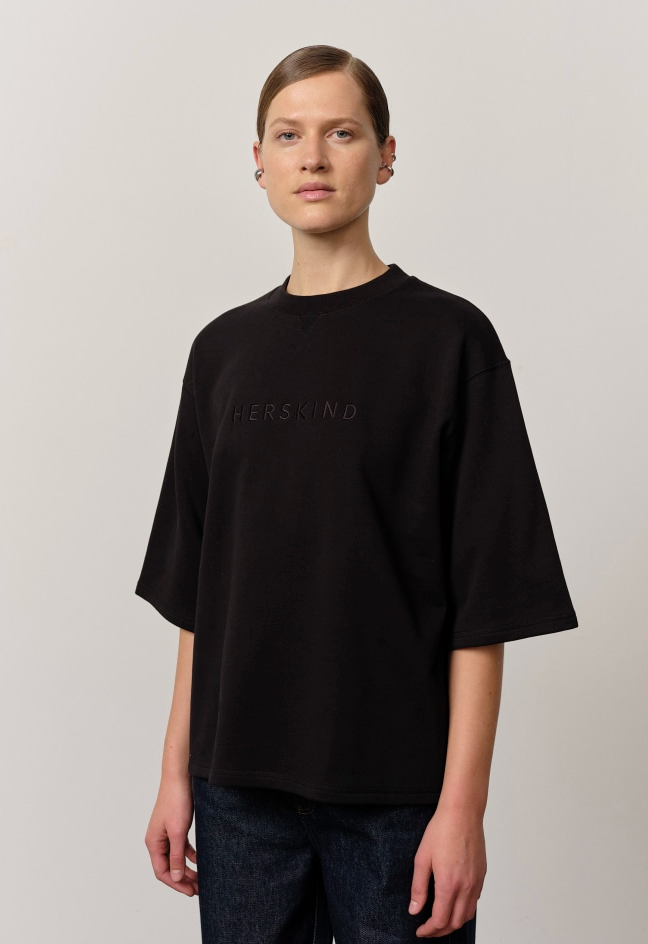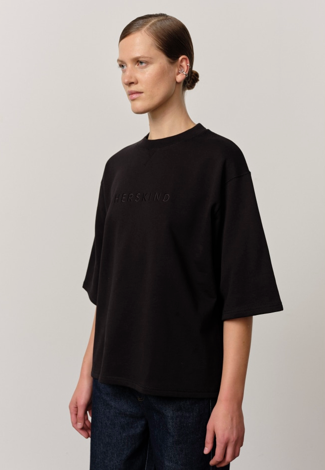 Denne sorte Herskind t-shirt har en oversized silhuet, der giver en afslappet følelse. Den bløde og åndbare kvalitet sikrer komfort hele dagen, mens det diskrete logo på brystet tilføjer et stilrent touch.