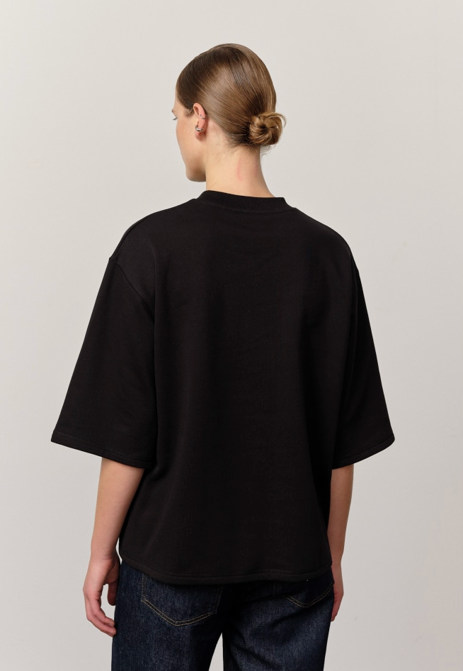 T-shirten har en rummelig, oversized pasform med korte ærmer og et afslappet snit.