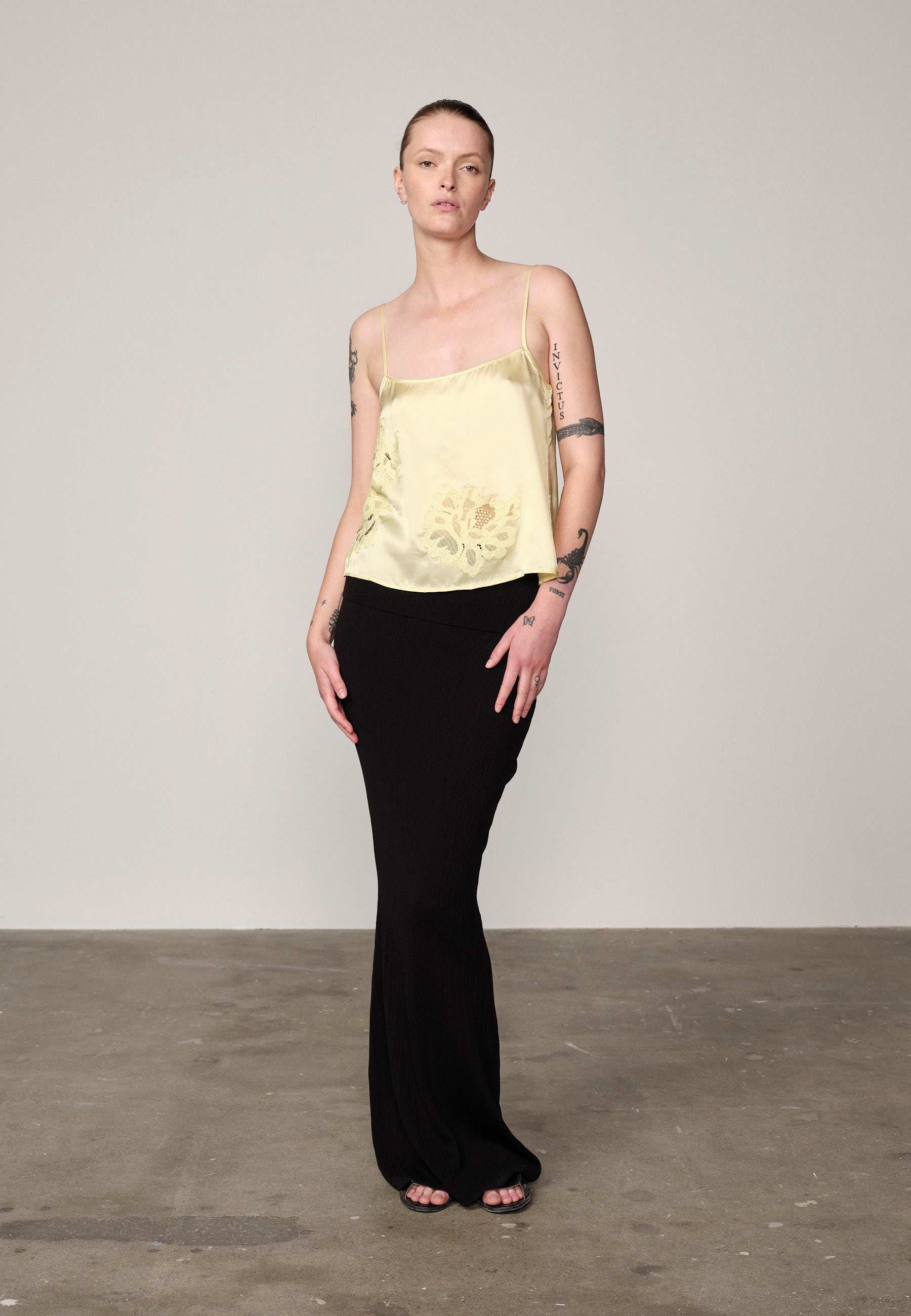 Løs og let silhuet med cropped længde, lige udskæring og smalle, justerbare stropper. Blødt fald kombineret med en diskret struktur.
