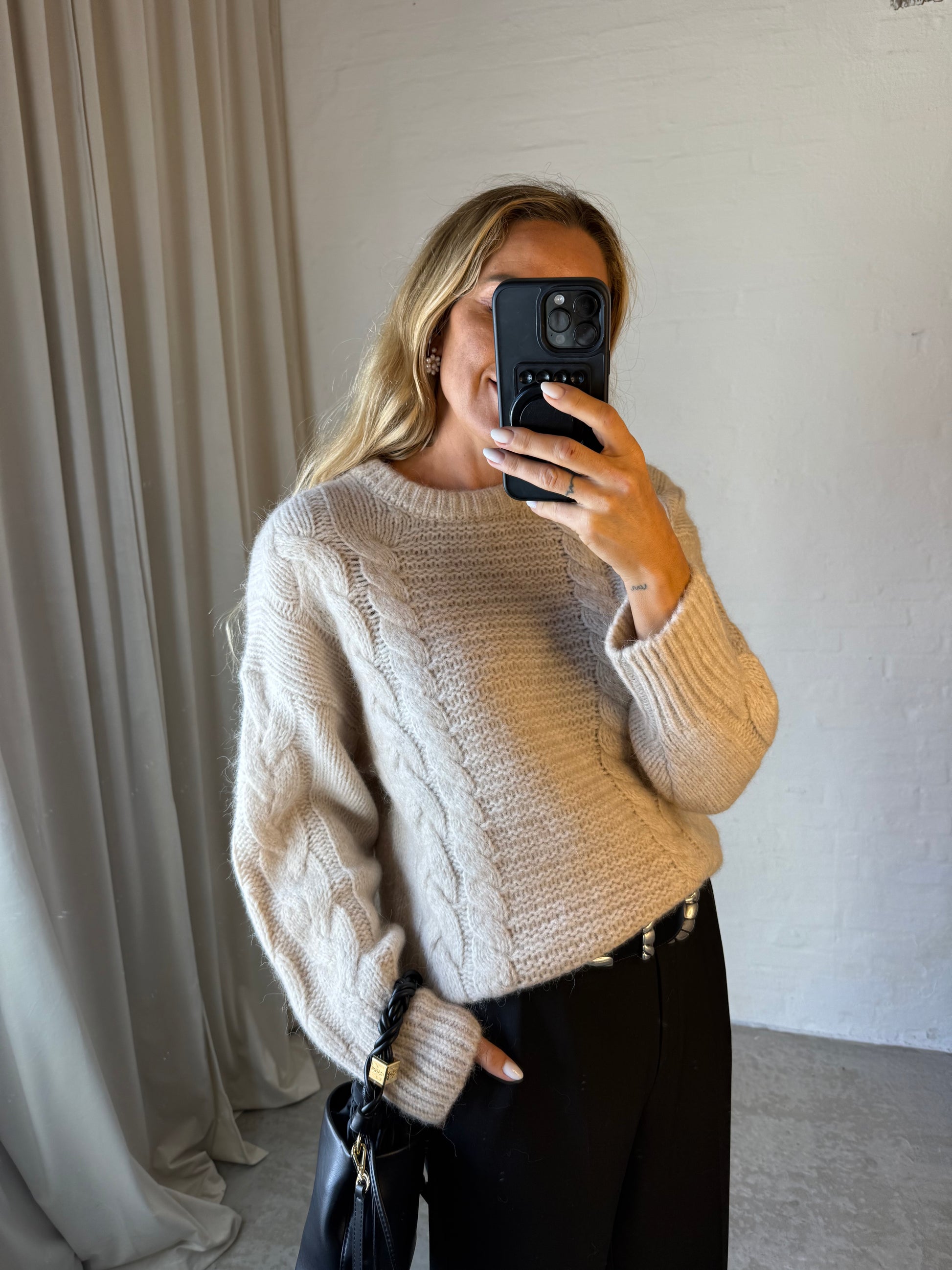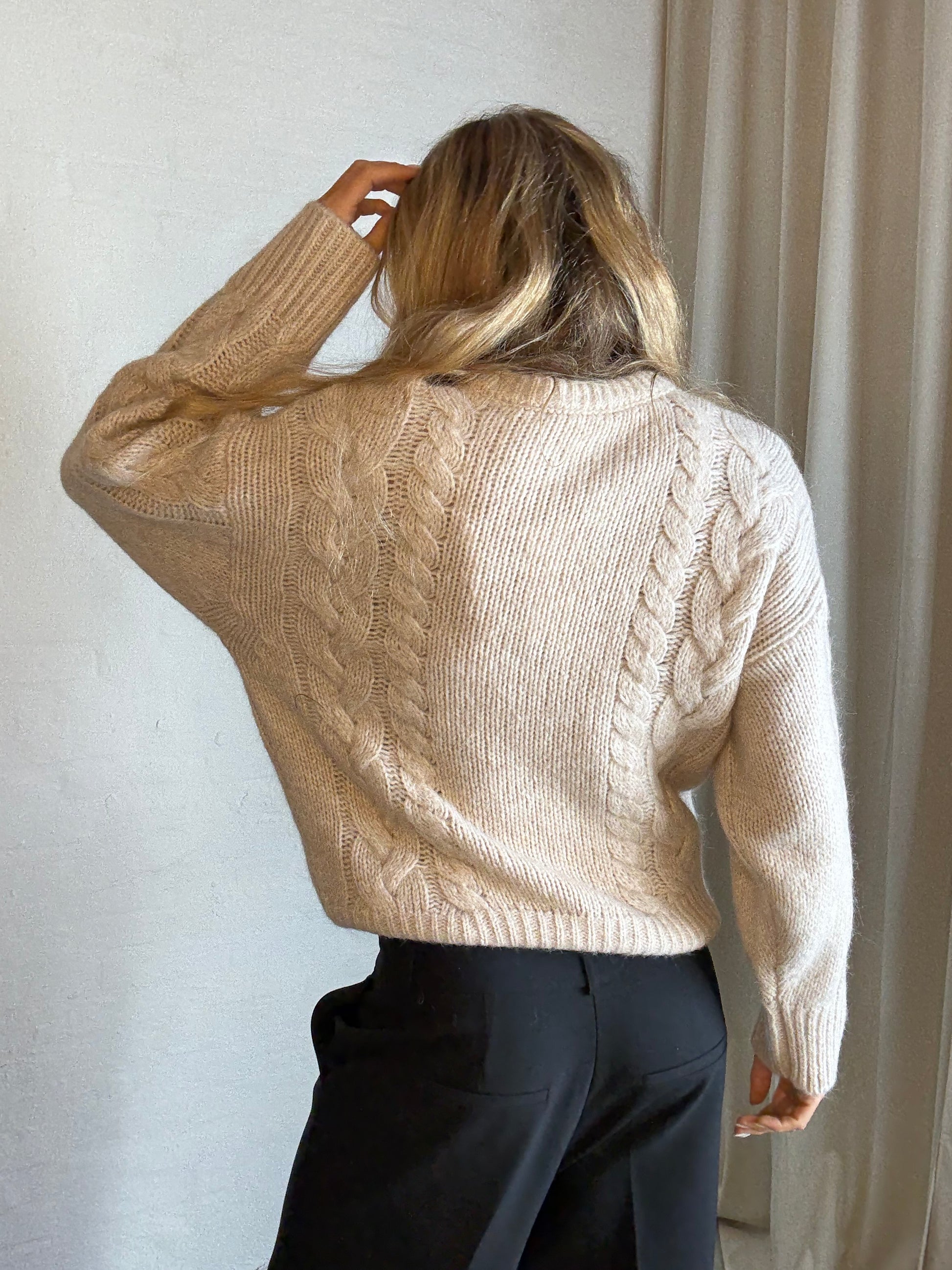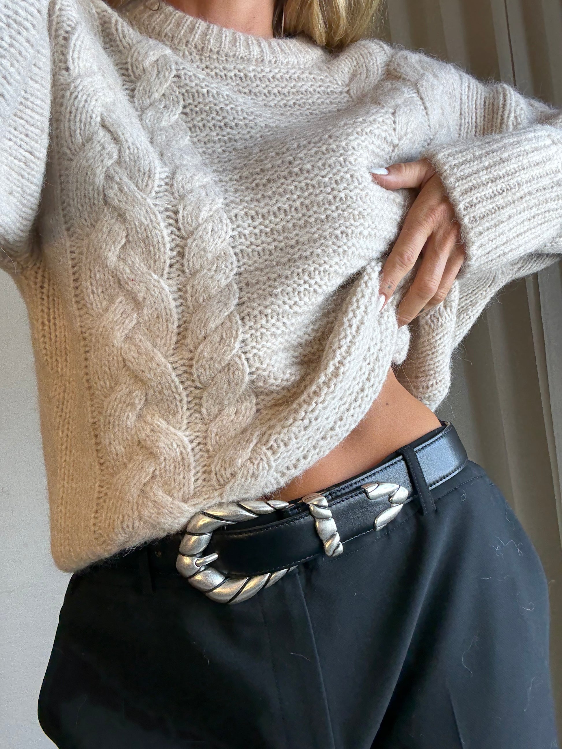 Den oversize pasform giver dig bevægelsesfrihed og mulighed for at style sweateren, som du ønsker. Kabelstrikken tilføjer et sofistikeret touch, der løfter dit outfit, hvad enten du matcher den med jeans eller nederdel.