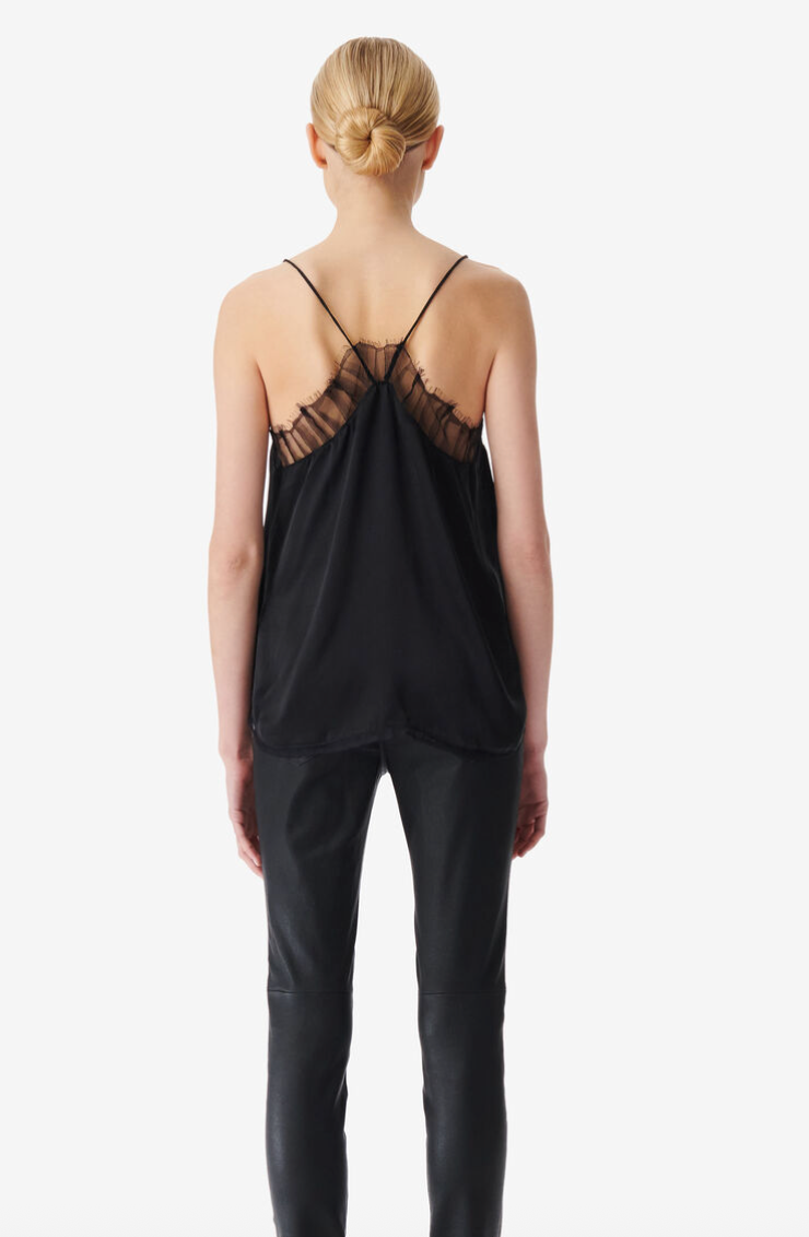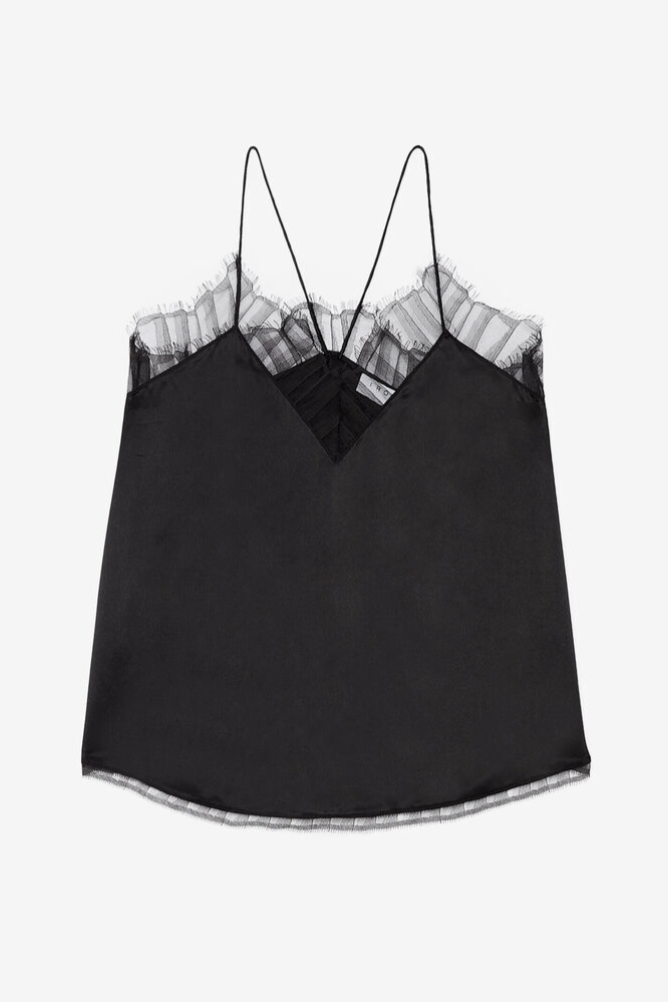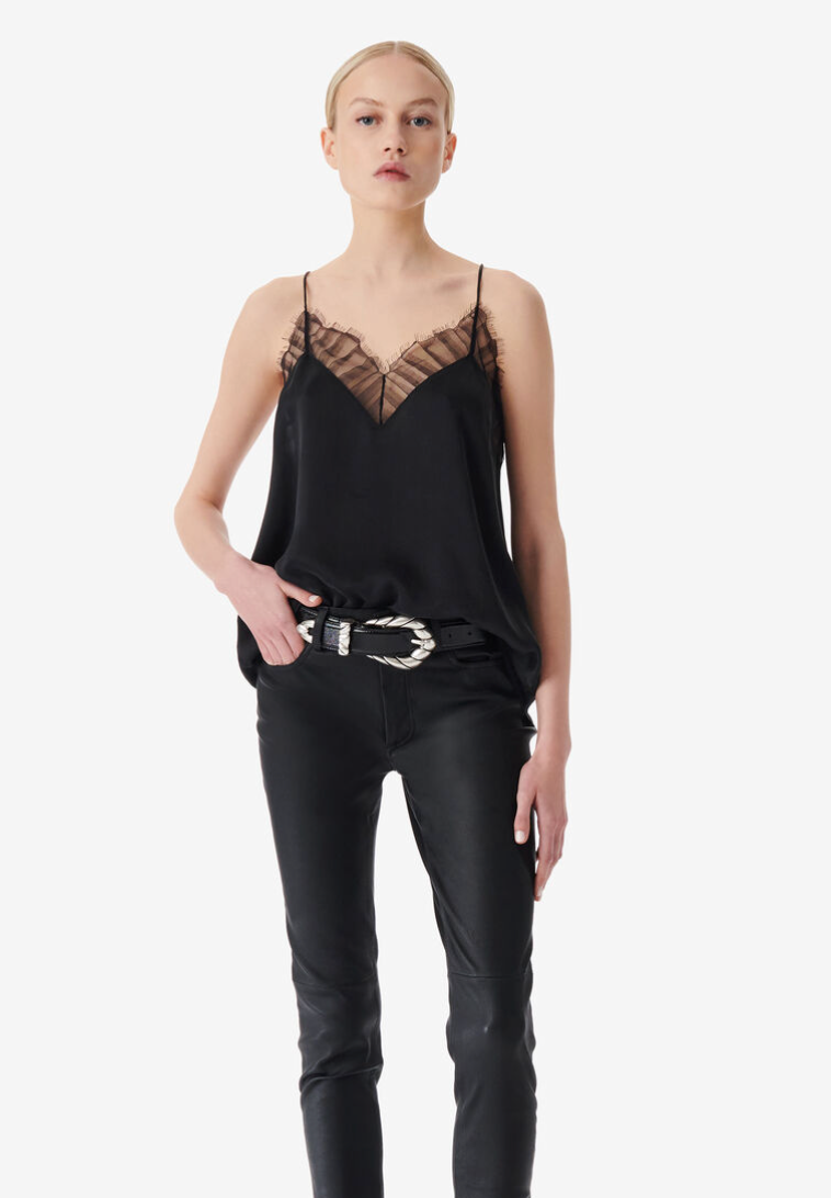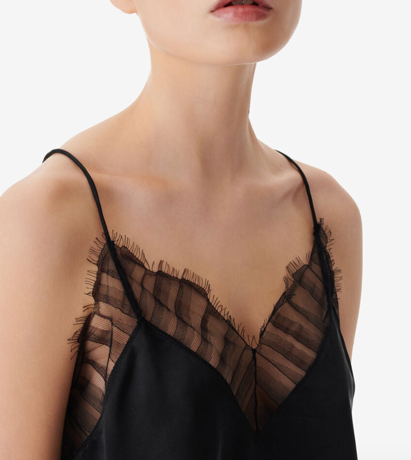 Denne IRO Berwyn-top kombinerer tynde stropper med delikate blondedetaljer på både for- og bagside. V-udskæringen med gennemsigtig blonde skaber et let og sofistikeret udtryk, der passer til cocktailparties.
