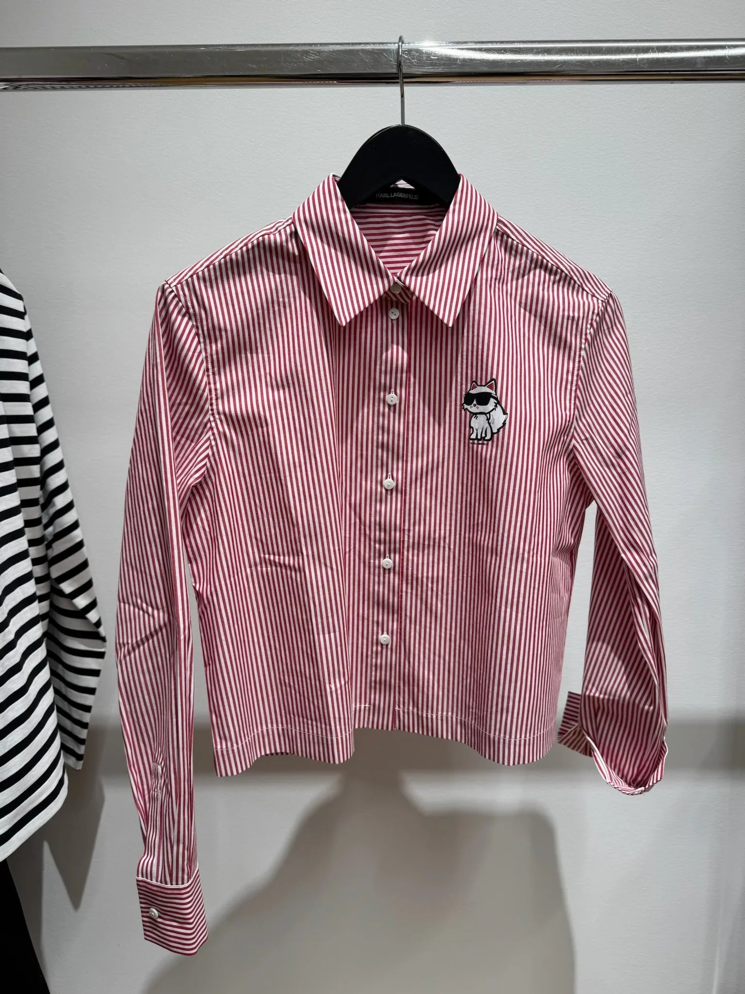 Fin stribet cropped skjorte fra Karl Lagerfeld. Skjorten har en klassisk krave og Karls logo på den ene side.