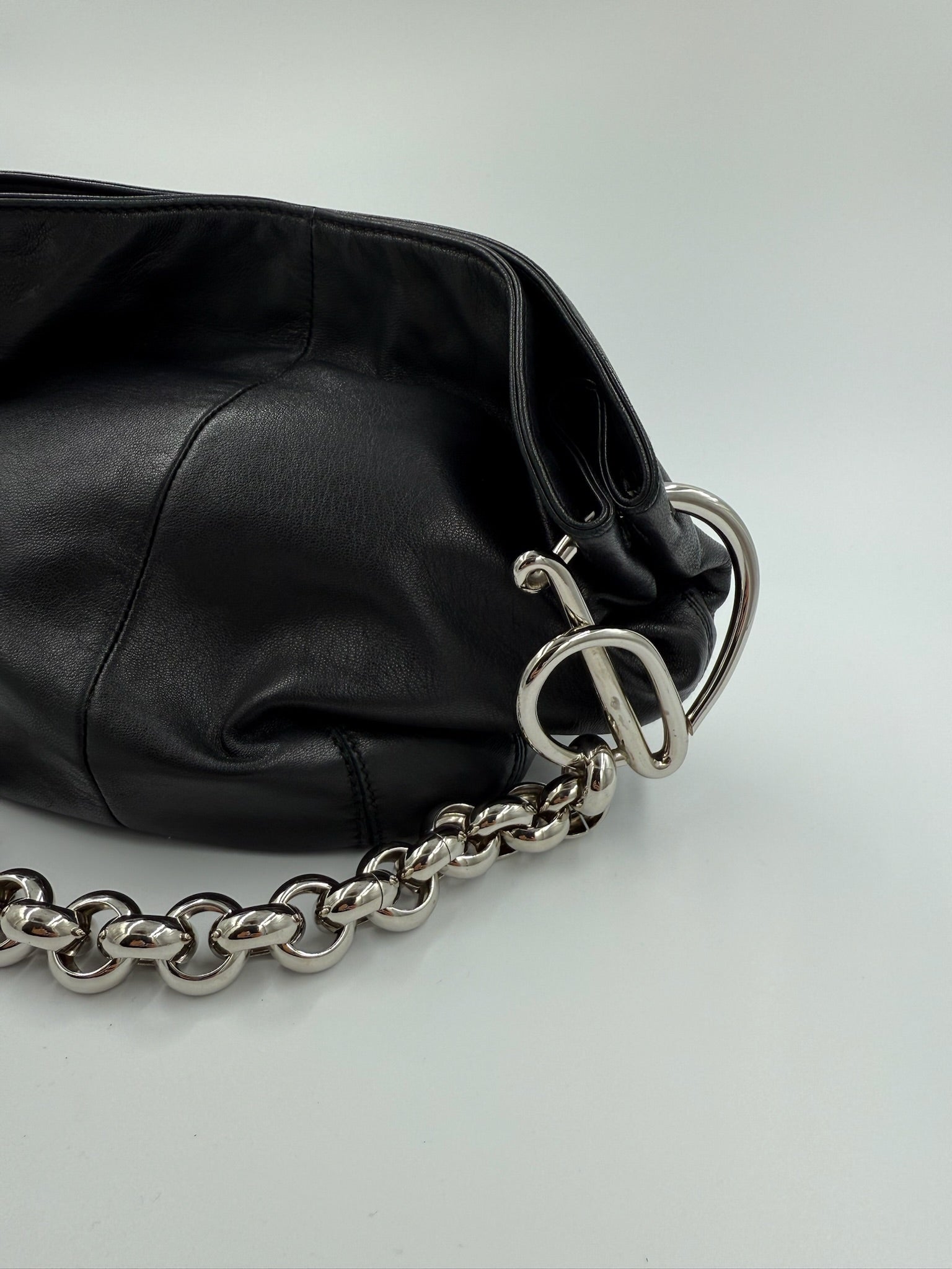En elegant og tidløs hobo-taske fra Loewe, designet i blødt sort læder af høj kvalitet. Tasken har et minimalistisk udtryk, hvor luksuriøse detaljer som den kraftige sølvfarvede kæderem med karakteristiske Loewe-logoled giver et eksklusivt præg.