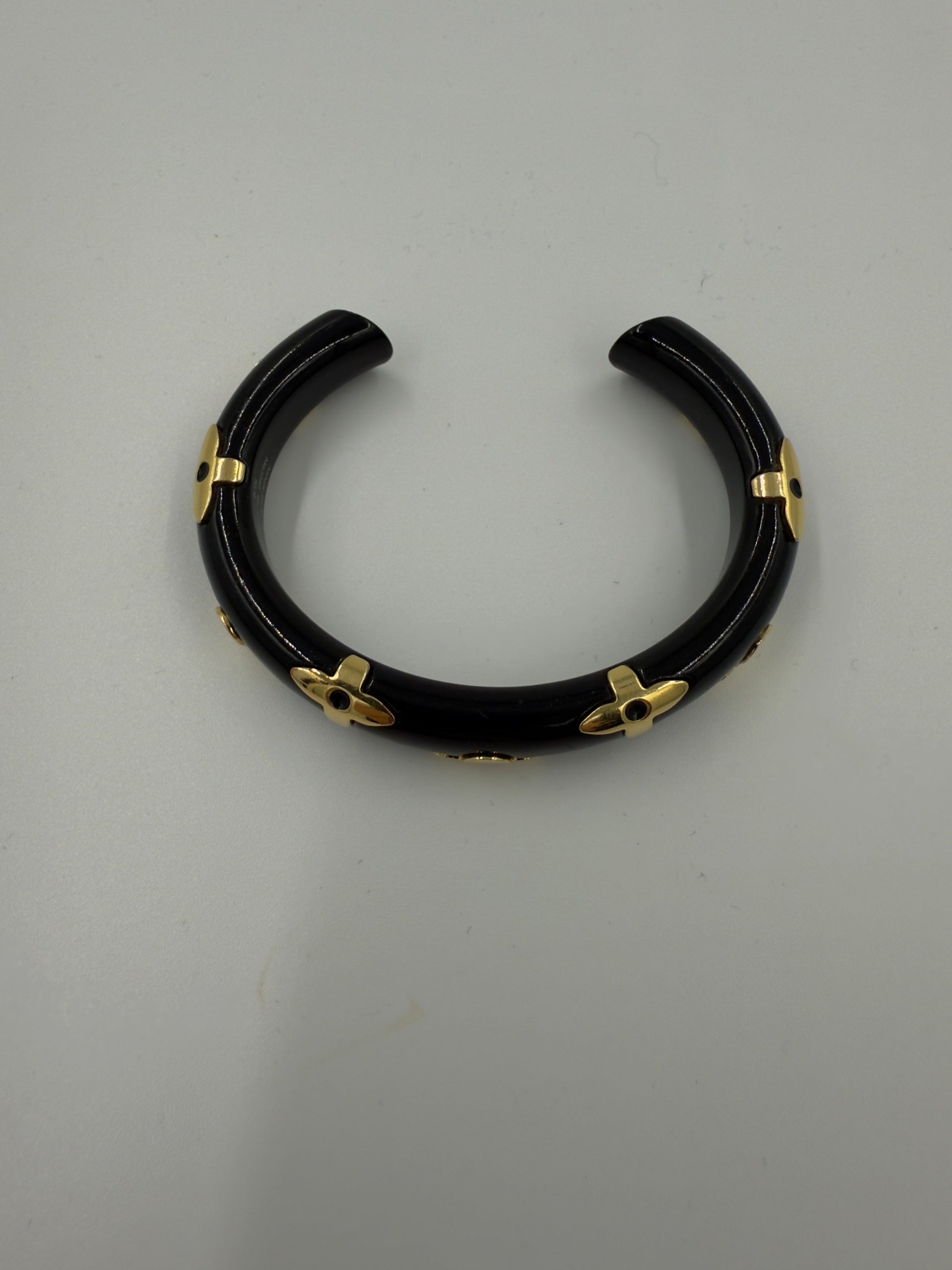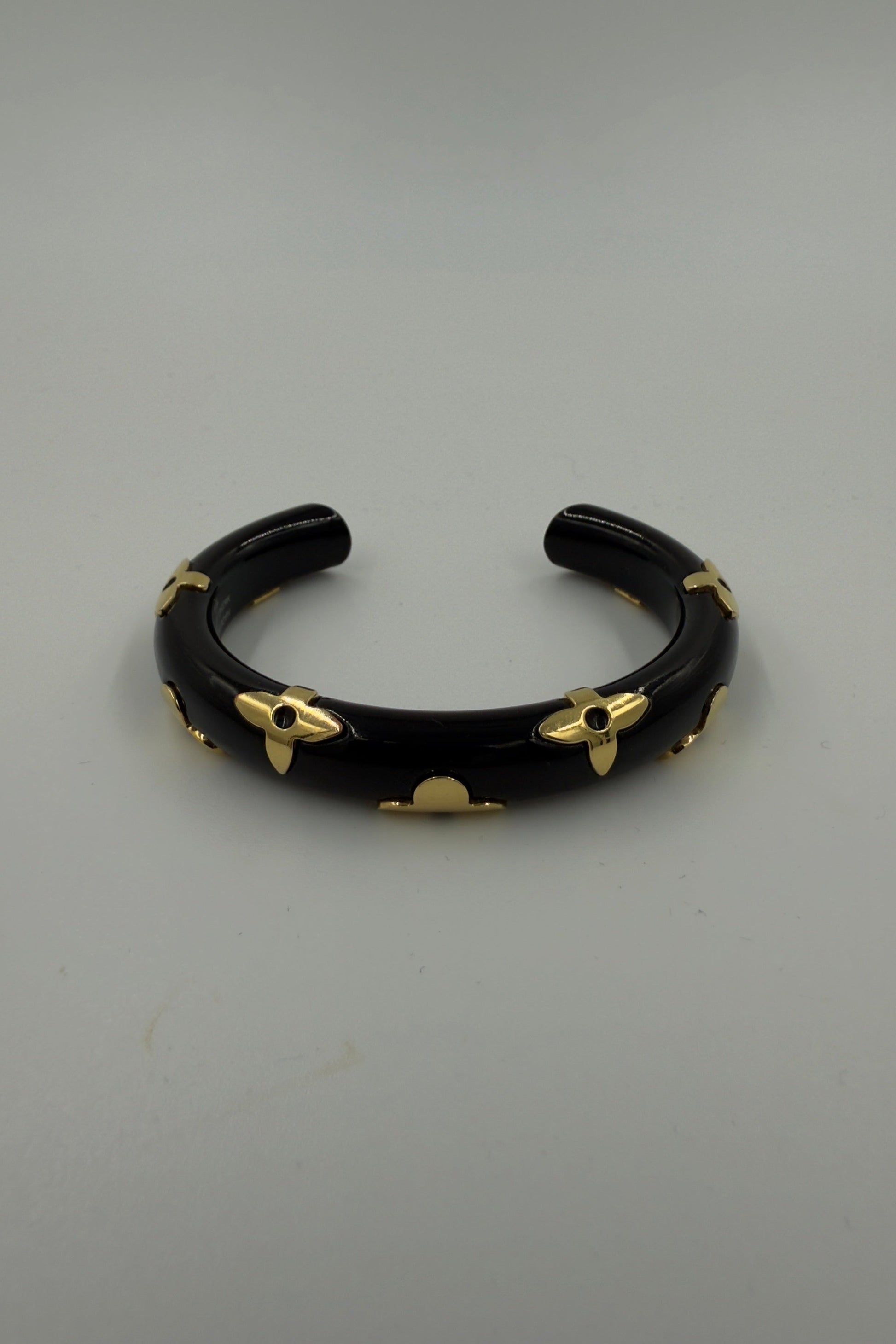 Dette elegante armbånd fra Louis Vuitton er designet som en åben cuff og fremstillet i sort, glansfuldt læder. Rundt om bøjlen er der monteret guldfarvede metaldele formet som de velkendte monogram-blomster, hvilket giver smykket et markant og sofistikeret LV-udtryk.