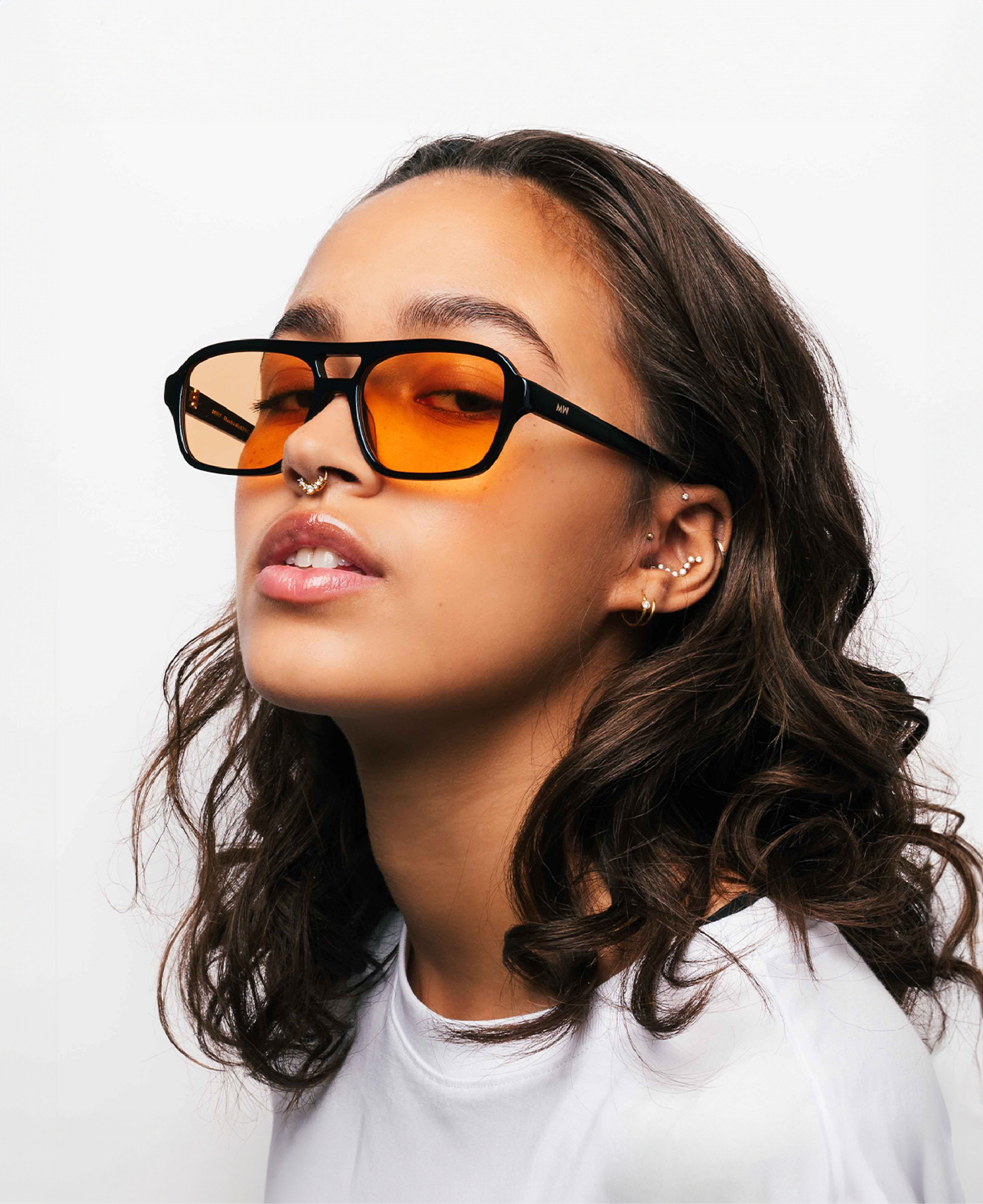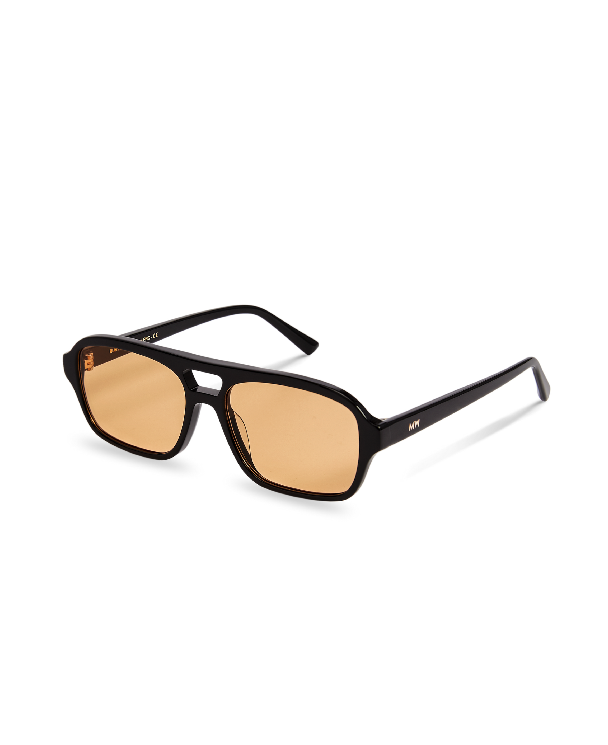 Stilfulde solbriller med et markant design fra Messy Weekend. Den sorte ramme kombineret med varme orange linser skaber et moderne og karakterfuldt look, der tilfører kant til både afslappede og mere stilrene outfits. Den firkantede form og den karakteristiske bro giver modellen et cool, retroinspireret udtryk.