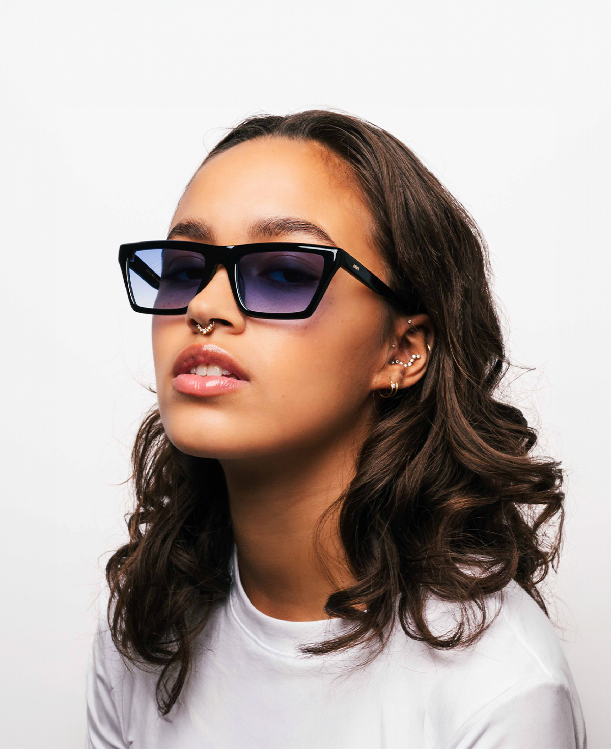 Messy Weekend NEW COREY i farven Blue Black er en stilfuld solbrille med et markant udtryk inspireret af 80’ernes ikoniske æstetik. Den skarpe, kantede form og det solide sorte stel giver et selvsikkert og moderne look, der tilfører kant til enhver stil.