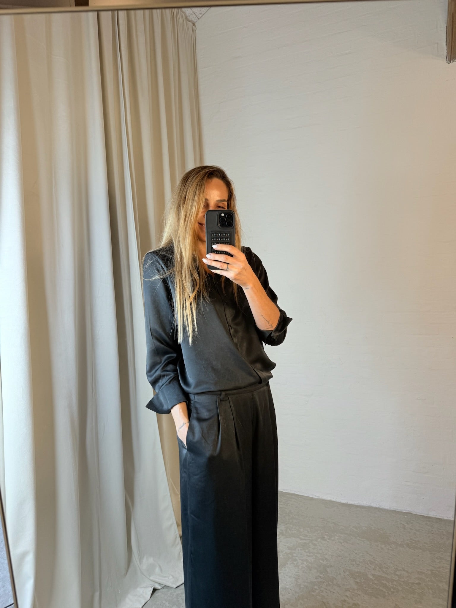 Disse sorte satinbukser med wide-leg pasform forener komfort og elegance på smukkeste vis. Det let glansfulde materiale falder flot og tilfører et eksklusivt udtryk, der fungerer perfekt til både hverdag og fest. Bukserne har høj talje med bæltestropper, fine læg foran og en flydende silhuet, som skaber et feminint og stilrent look.