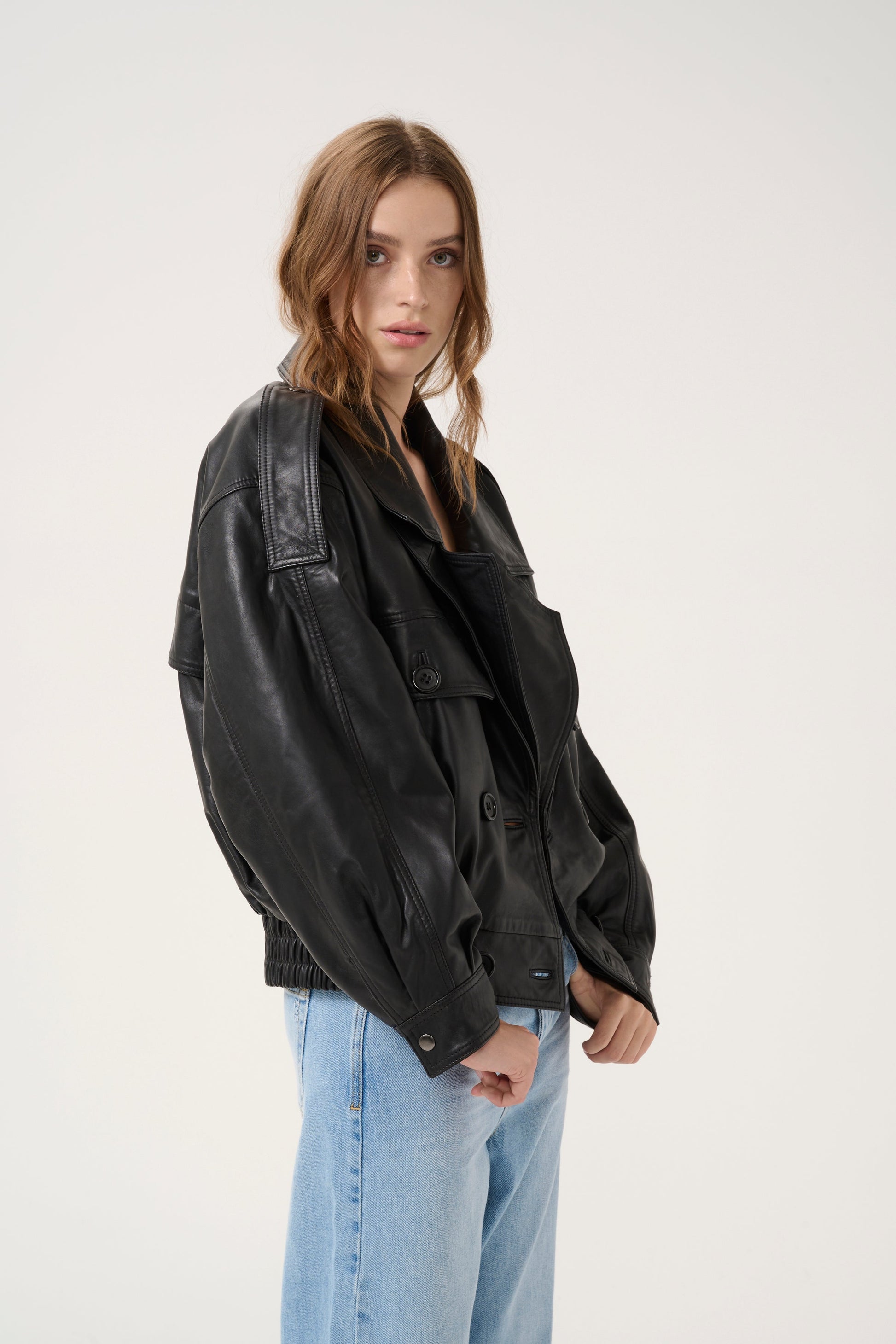 Jackie-læderjakken fra My Essential Wardrobe giver dig en løs, oversized pasform i blød lammelæderkvalitet. Med markante skulderpuder og praktiske forlommer er den ideel til afslappede byture og cafébesøg.