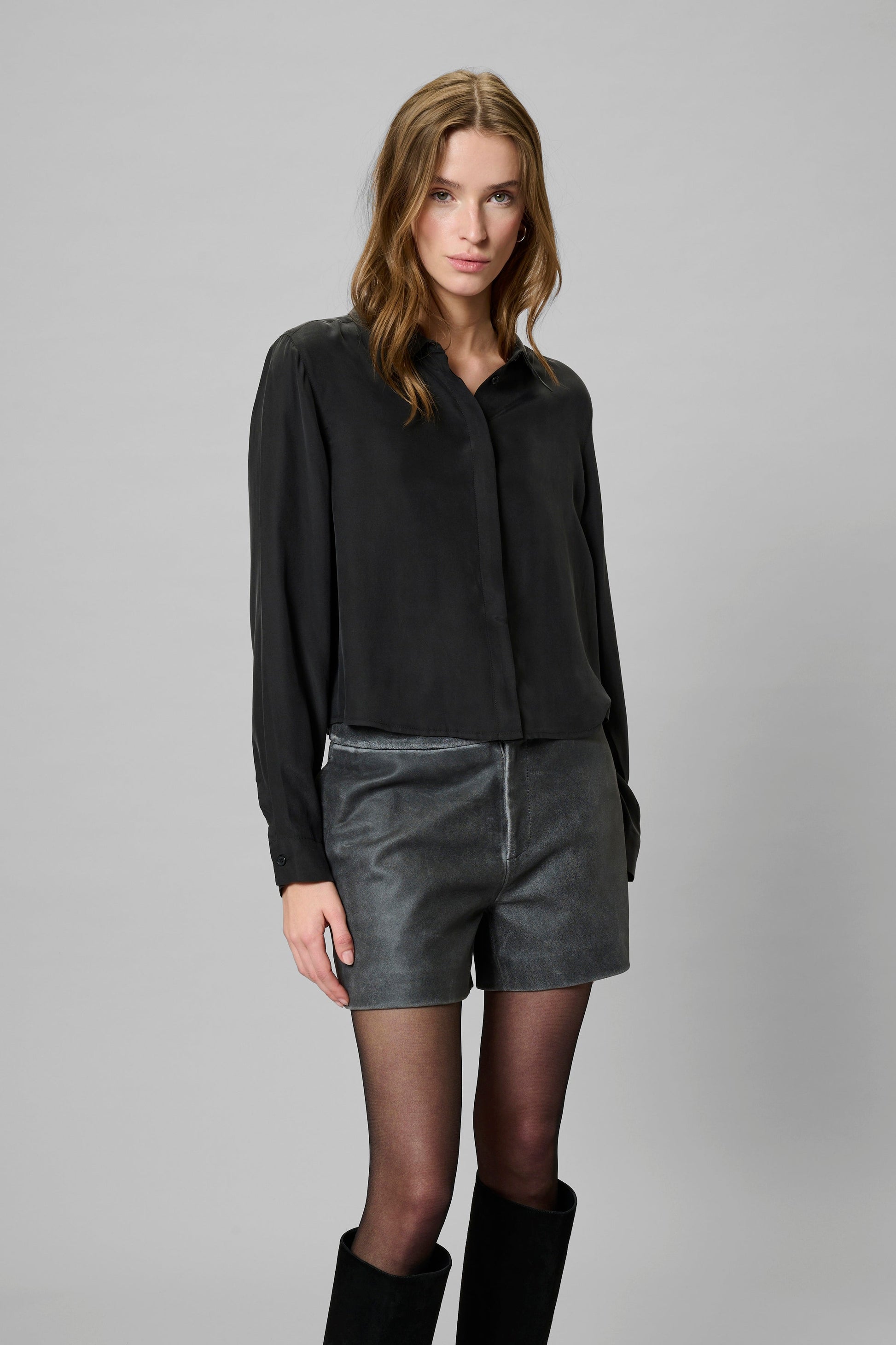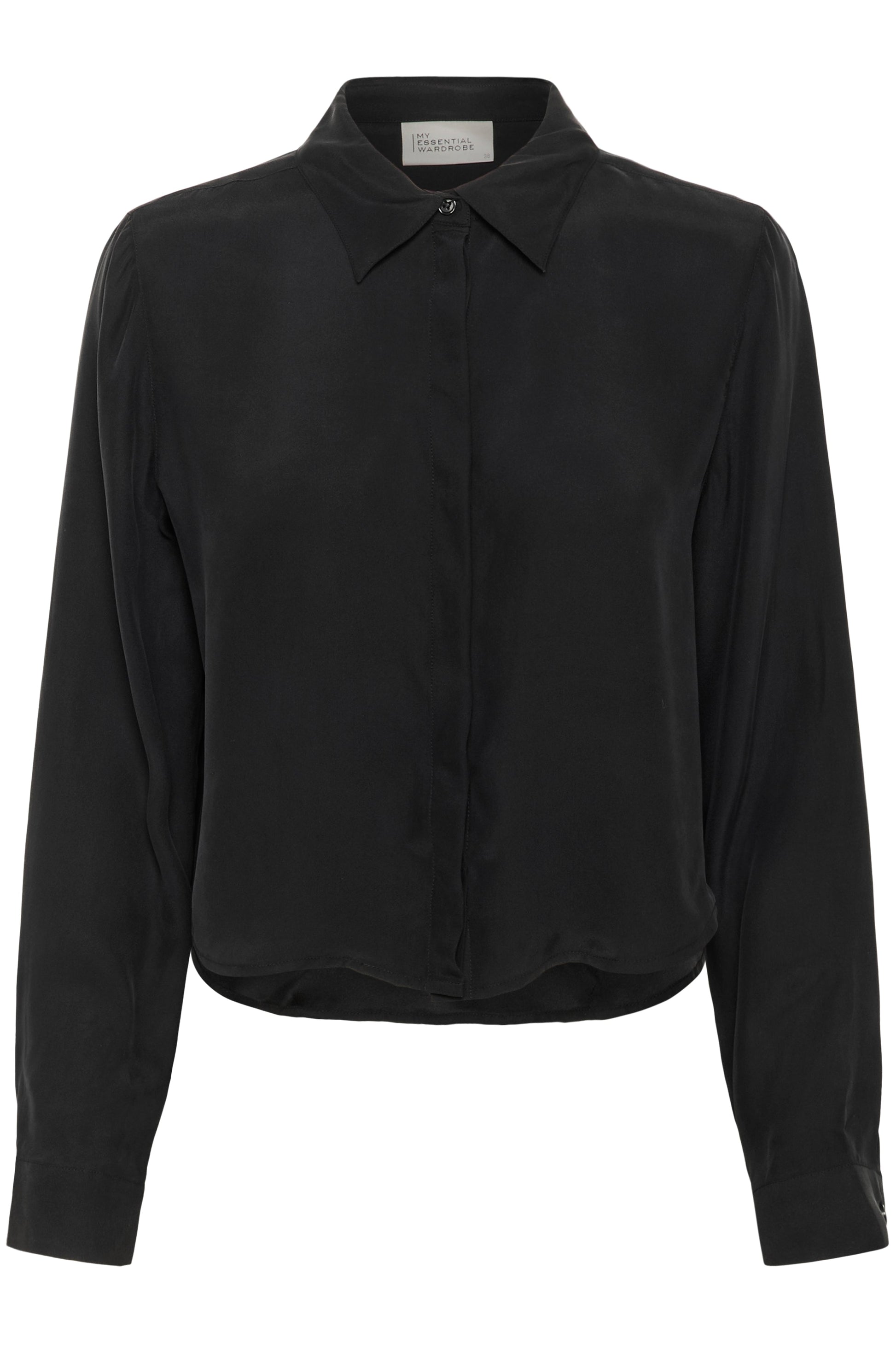 Denne smukke sorte skjorte fra My Essential Wardrobe er fremstillet i 100% silke, hvilket giver et eksklusivt og elegant udtryk. Skjorten har en let og glat kvalitet, der falder flot på kroppen og føles behagelig at have på. Det korte snit og den klassiske skjortekrave gør den ideel til både afslappede og mere formelle looks.