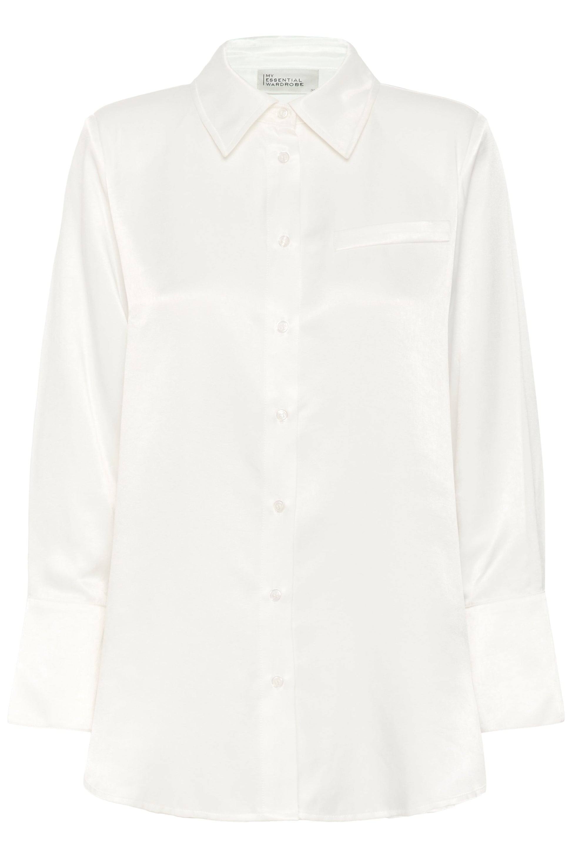 En elegant, lang satinsskjorte fra My Essential Wardrobe med et let og løstsiddende snit. Skjorten har knaplukning ned langs fronten og manchetter, der slutter tæt ved håndleddene for et stilrent og feminint udtryk.