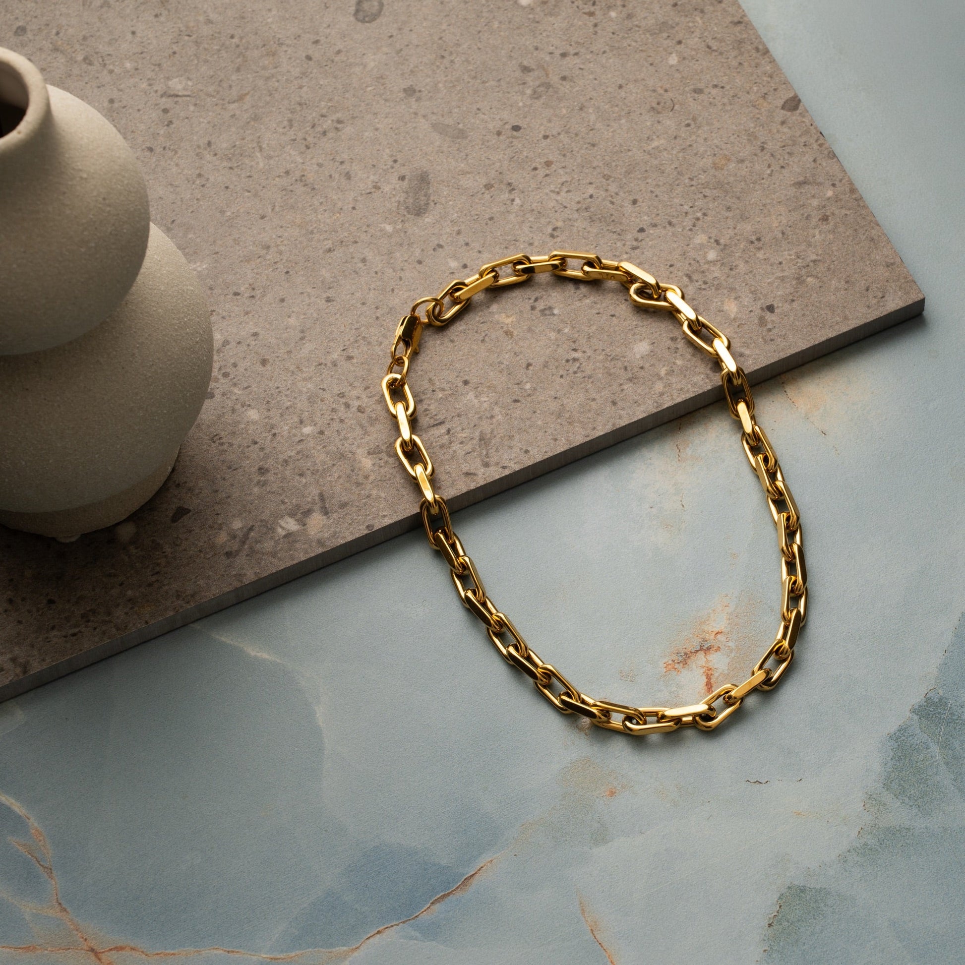Chunky halskæde med forlængede led i rustfrit stål og 18 karat guldbelægning. Dette statement-piece fra NINE tilføjer et dramatisk element til både festlige og afslappede outfits.