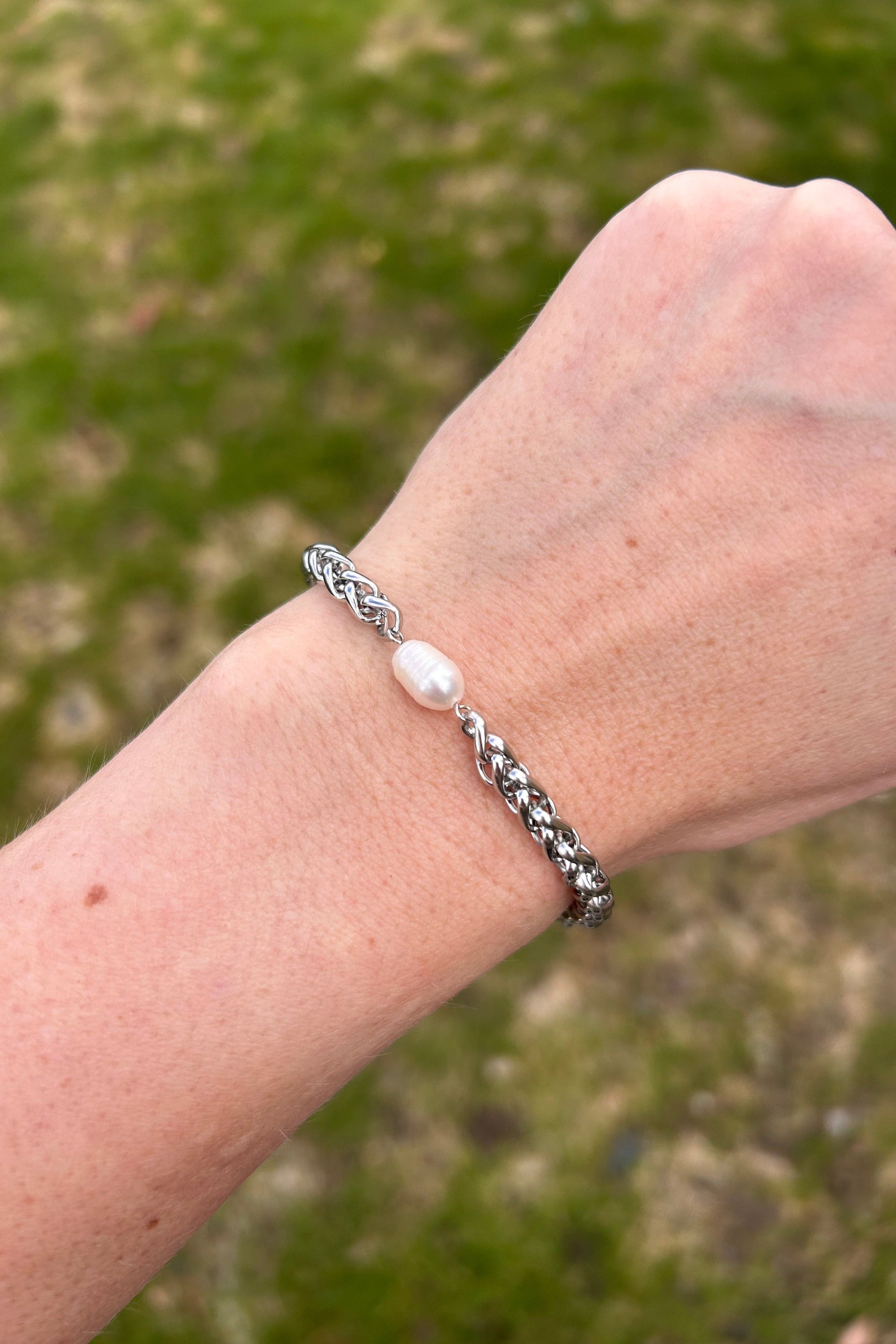 Et stilrent NINE-armbånd med et snoet kædedesign og en elegant perle i midten. Det kølige sølvlook giver et moderne udtryk, der passer både til hverdag og mere formelle anledninger. Armbåndet er vandfast og designet til behagelig brug uden irritation.