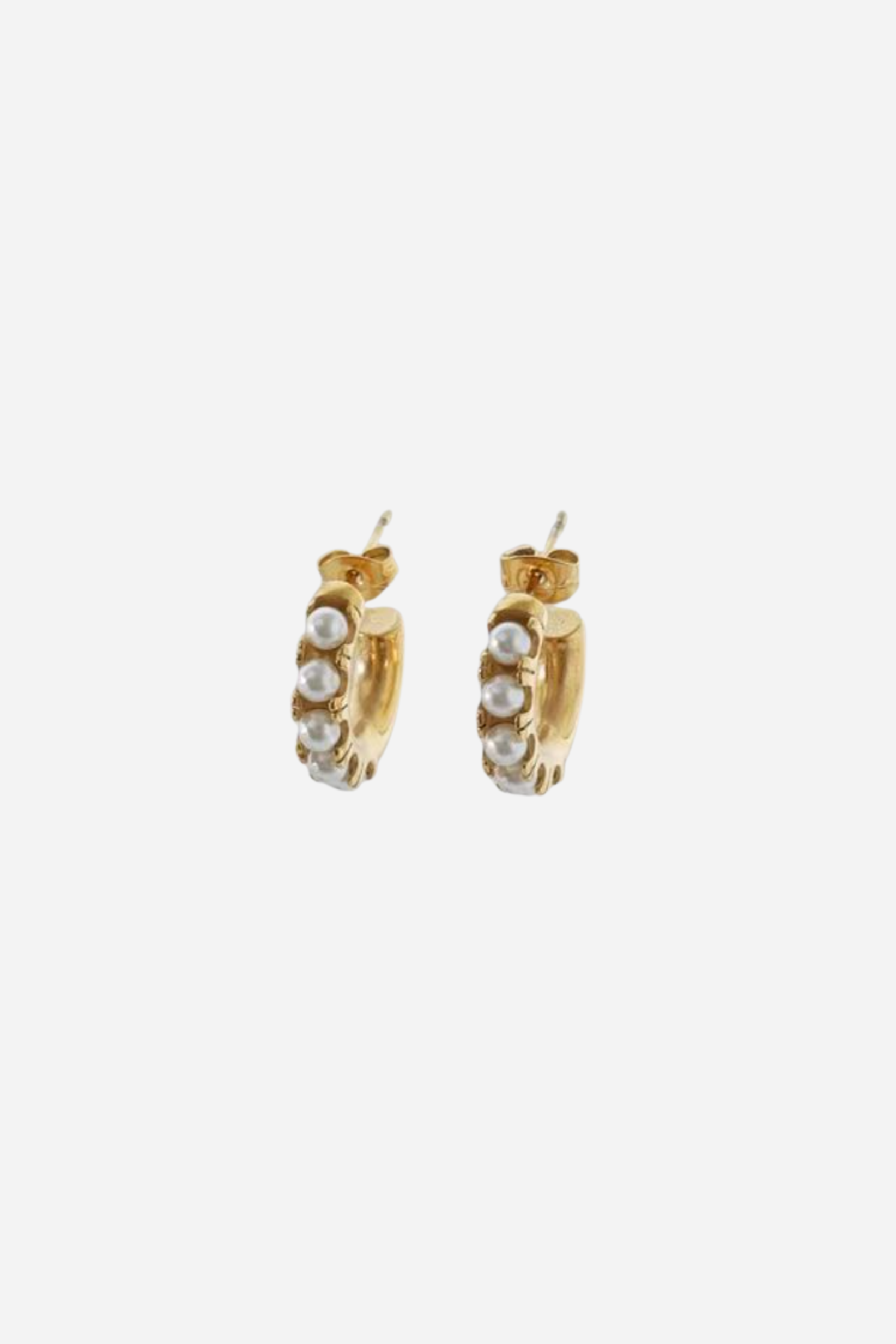 Disse vandfaste hoops har en karakteristisk rå overflade samt elegante perler og 18 karat guldbelægning. De er fremstillet af rustfrit stål og er 100 % nikkelfri og allergivenlige, så du kan bære dem uden bekymring.