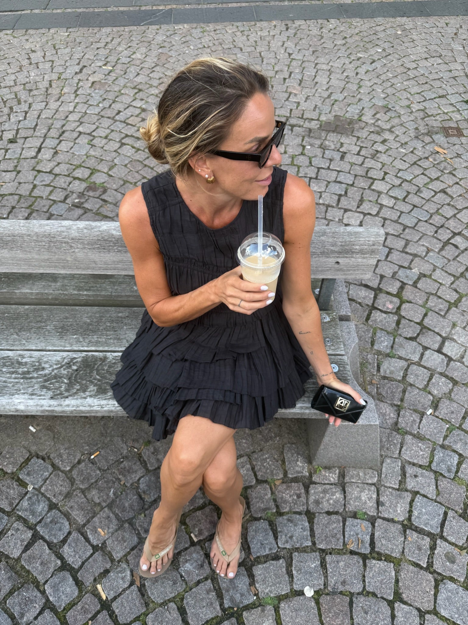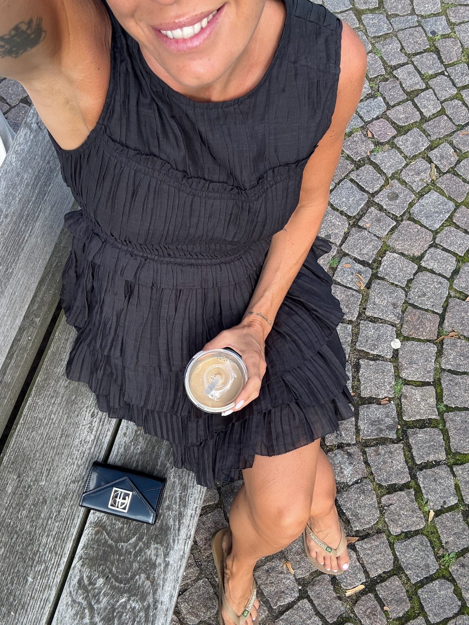 Mini-længden og den elastiske talje skaber en flatterende silhuet, der fremhæver det lagdelte design.