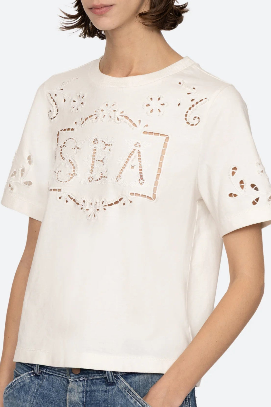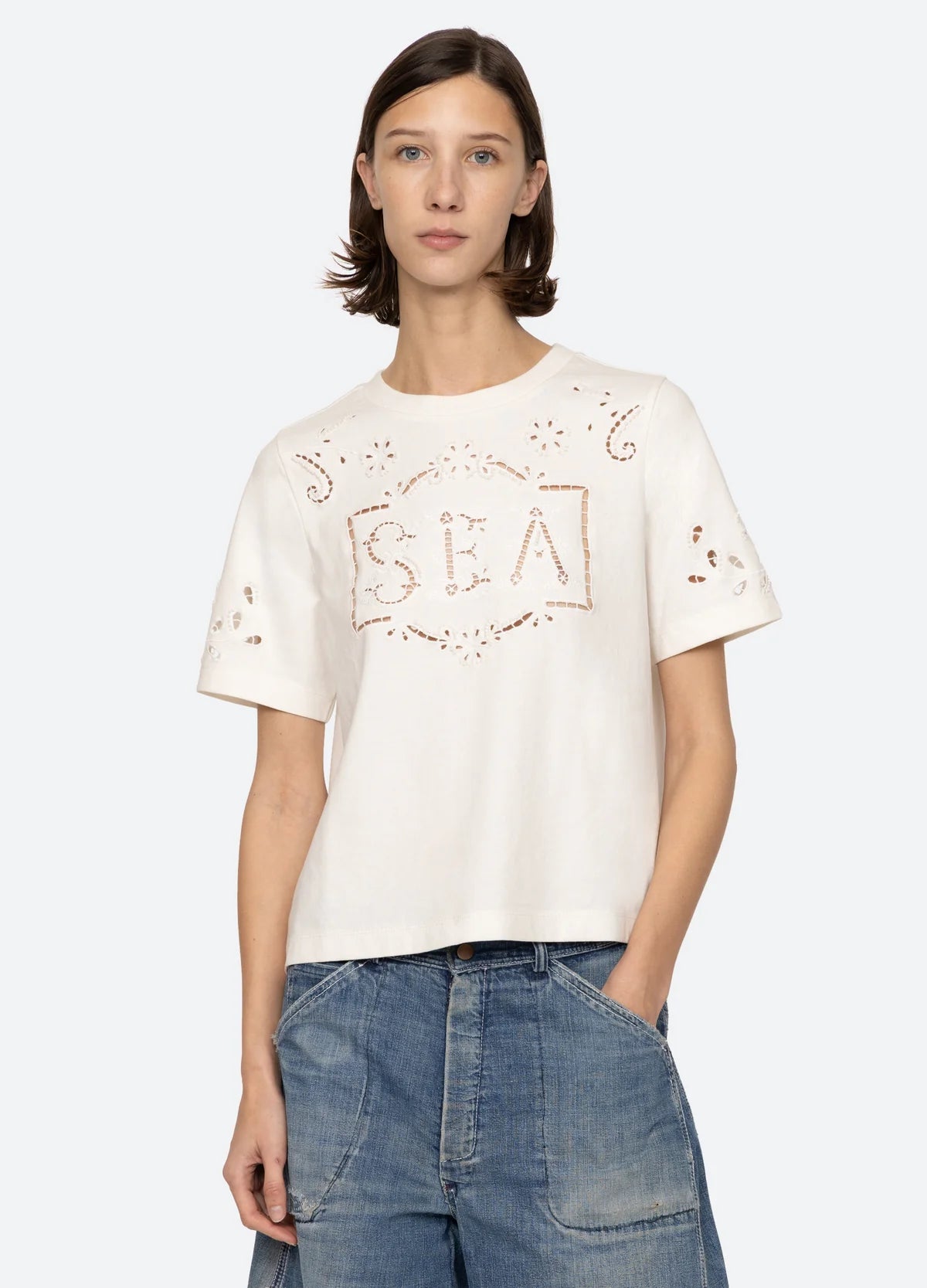 Denne hvide T-shirt fra Sea New York har et gennemgående broderi med et stiliseret SEA-logo og dekorative mønstre. Det håndlavede broderiarbejde gør den særligt velegnet til kulturelle begivenheder, hvor æstetik er i fokus.