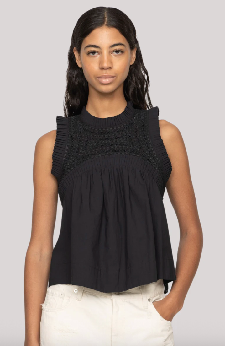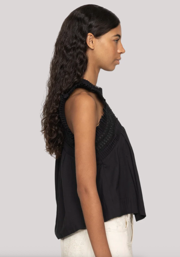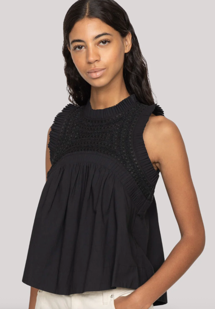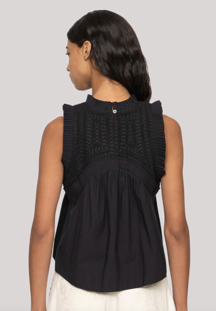 Denne Sea New York-top har karakteristiske broderidetaljer på skuldrene og ryggen. Den plisserede halsudskæring og løse pasform gør den ideel til uformelle, men stilfulde sammenkomster som brunch eller havefester.