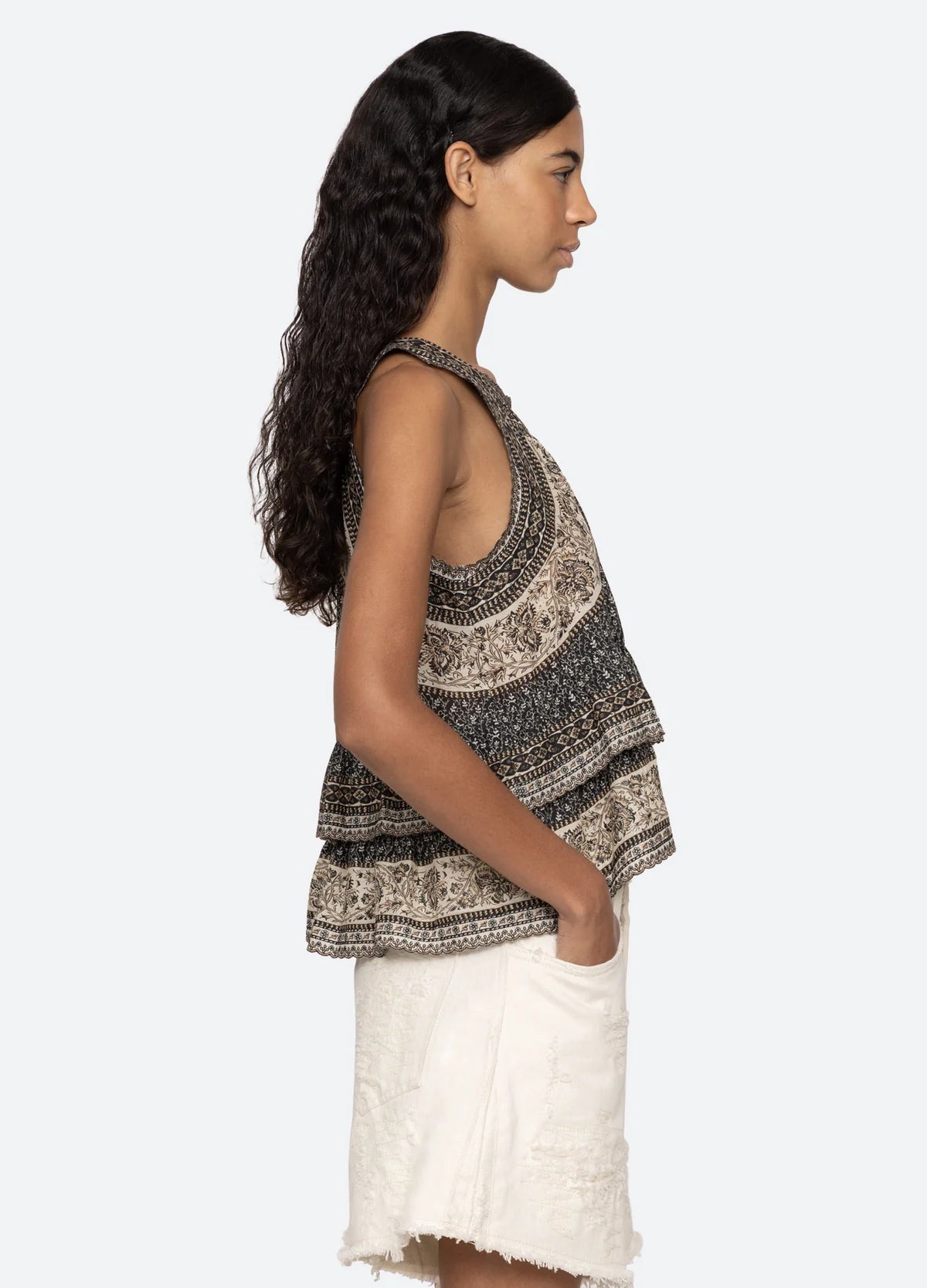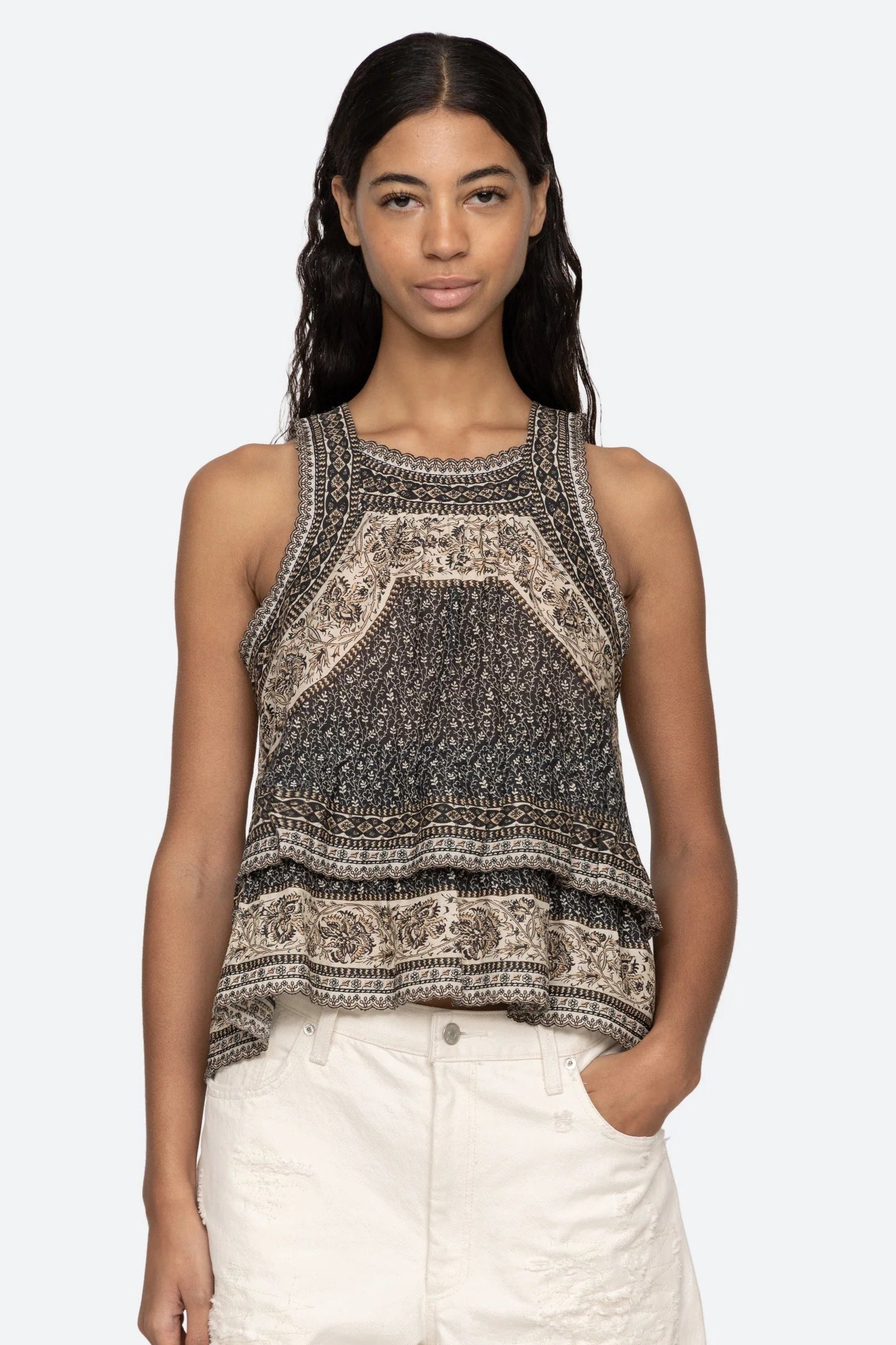 Mønstret top med flæsedetaljer