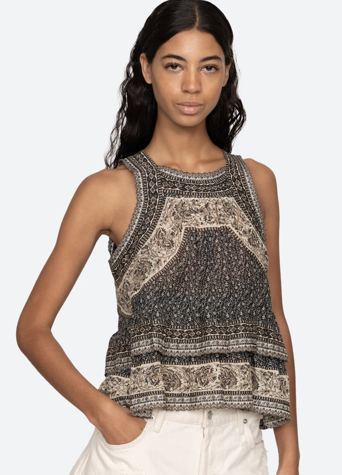 Denne Sea New York Palma-top har et unikt design med blomstrede og geometriske mønstre. Den lagdelte flæsekant og den runde halsudskæring gør den ideel til stilfulde cafébesøg og sociale sammenkomster.