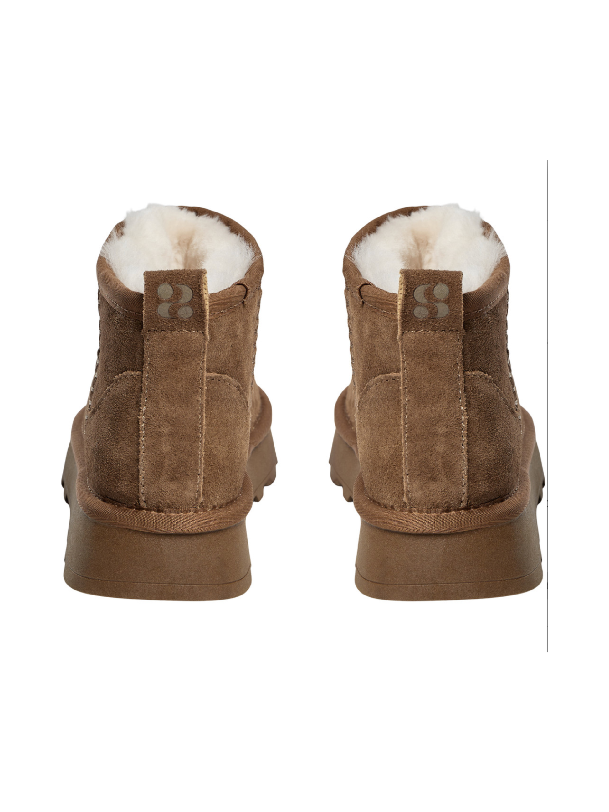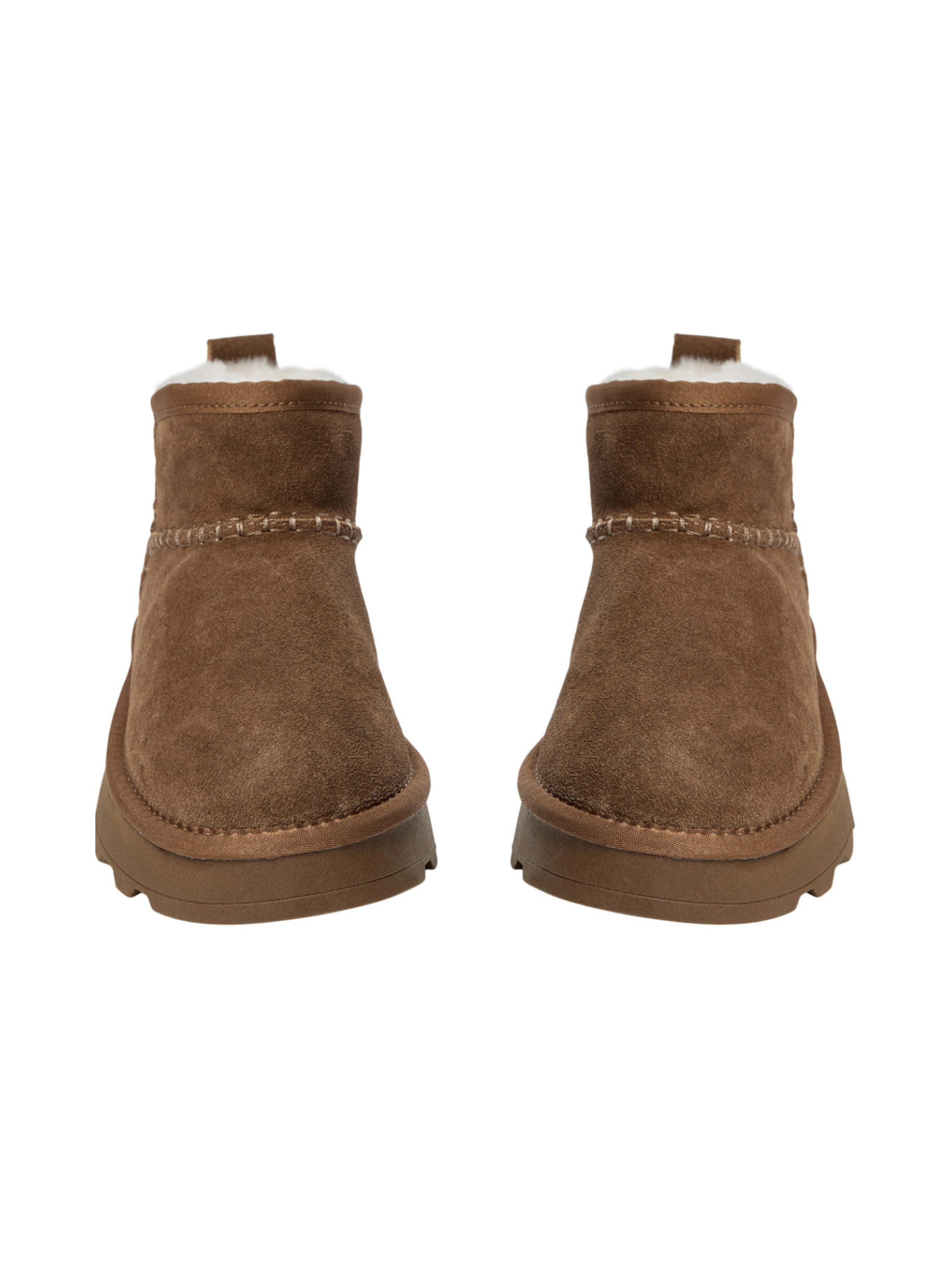 Denne bamsestøvle fra Sofie Schnoor er fremstillet i 100 % ruskind med en blød fåreuld på indersiden. Materialevalget sikrer både varme og komfort, mens de synlige stikninger giver støvlen et karakteristisk udtryk.